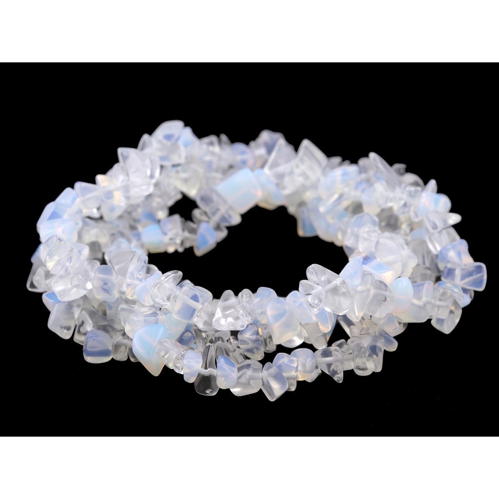Fraktionen von Opalite - sind eines der vielseitigsten Schmuckelemente. Auf einem Strang befinden sich etwa 230 Fragmente. Sie können mit unterschiedlichen Materialien wie Glas, Kunststoff, Holz, Metall usw. kombiniert werden. Fraktionen können auf Schnurdraht oder Ösenstift aufgefädelt und anschließend an Kette aufgehängt werden. Da es sich um ein natürliches Material handelt, haben Fragmente unterschiedliche Größen, Formen, Muster und Farben.