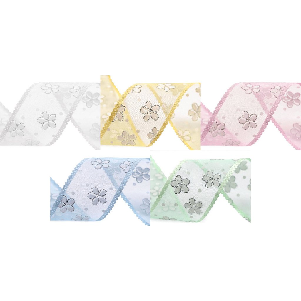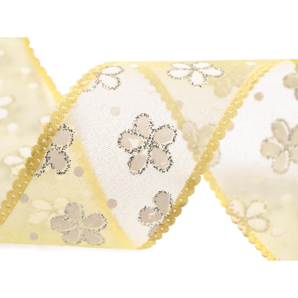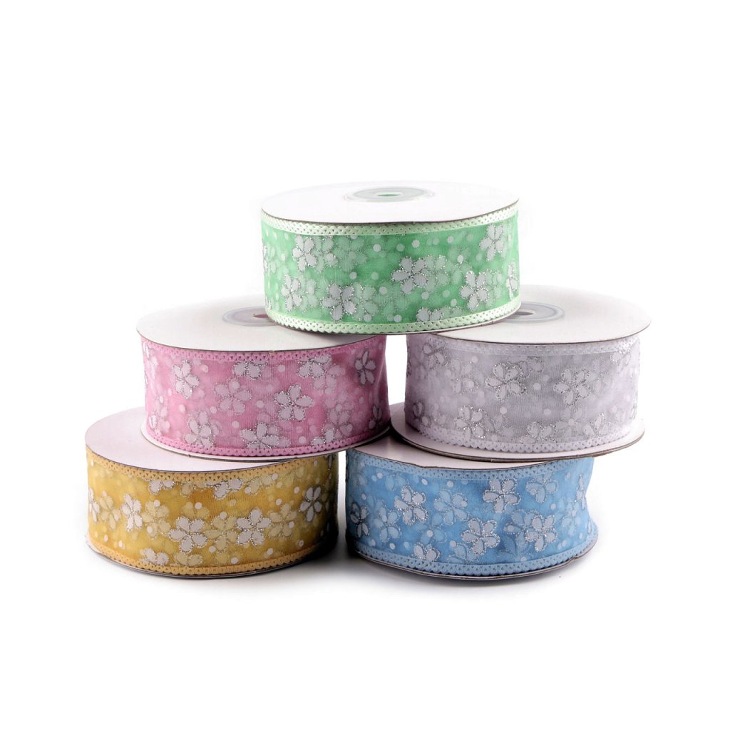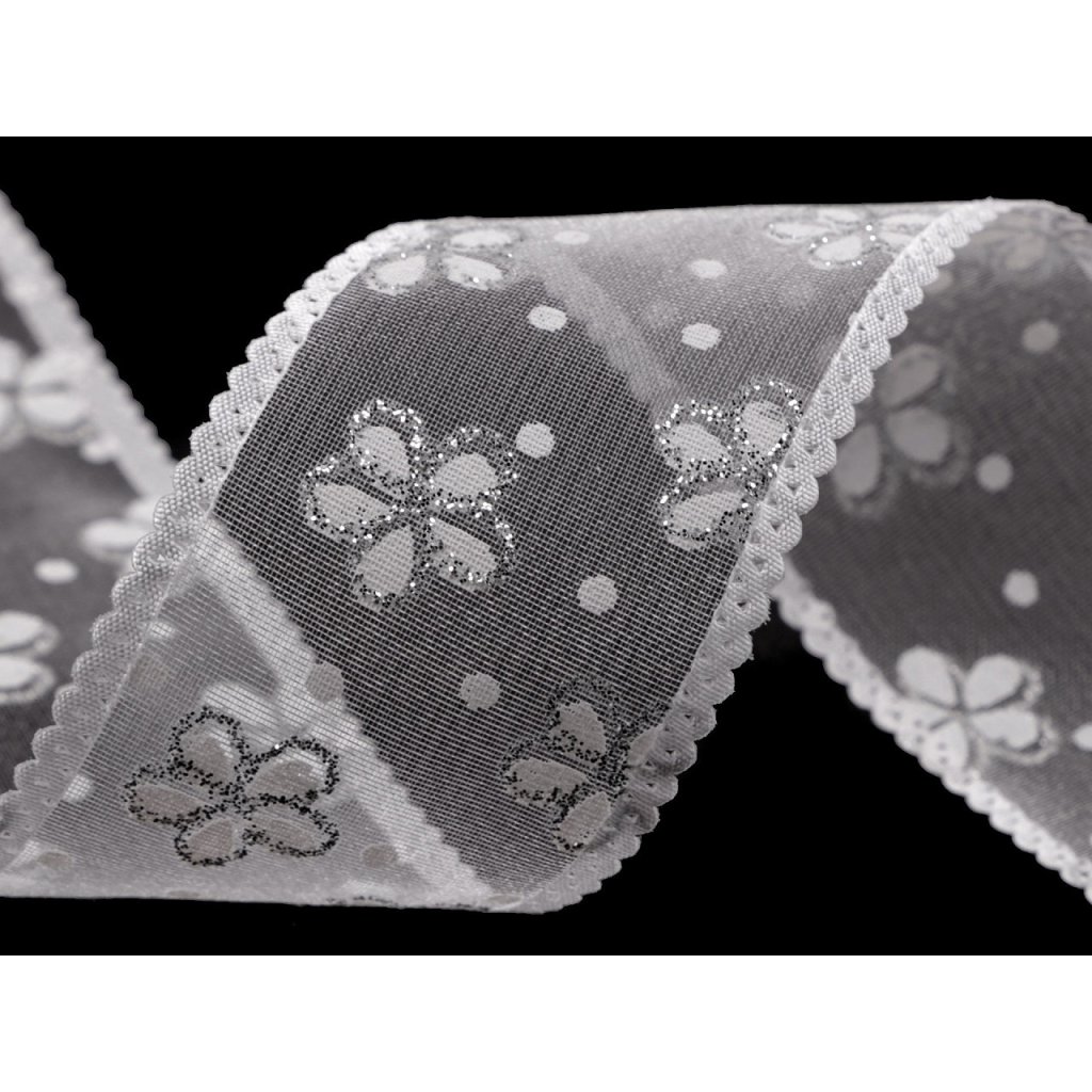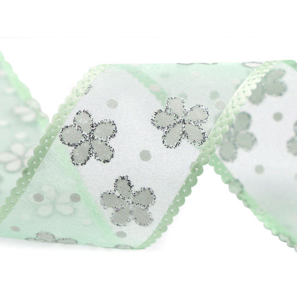 Durchscheinendes Organzaband mit Blumen und Tupfen, an den Seiten mit einer Satinborte mit Schleifen verstärkt . Es ist massiv, einseitig, die Blüten sind mit Glitzer verziert , der fest hält und nicht abfärbt. Verwendung: Sie können das Band zum Arrangieren von Frühlings- und Sommerdekorationen verwenden, Sie können es auch auf einer Hochzeit als Dekoration für Stühle, Tische, Autos usw. verwenden. Sie können daraus auch einfache Schleifen basteln, es eignet sich auch als dekoratives Geschenk Verpackung.