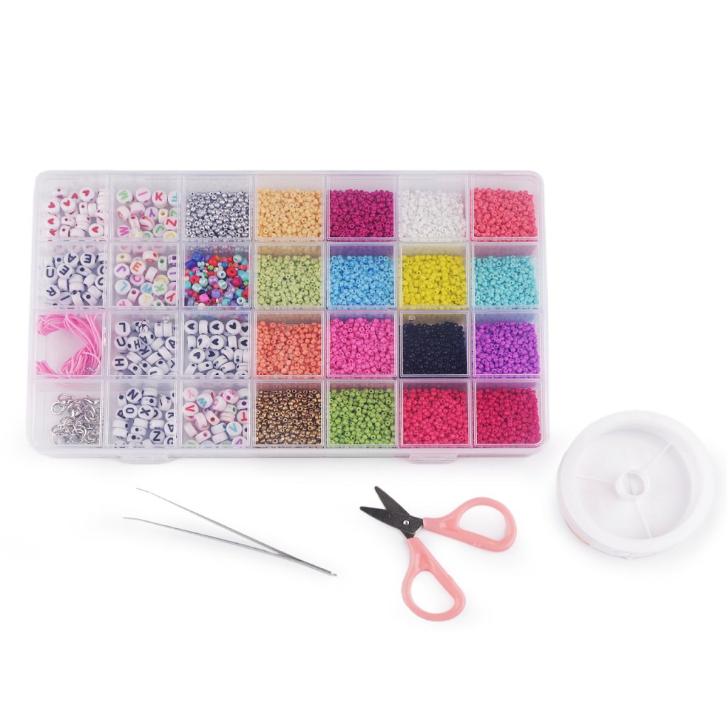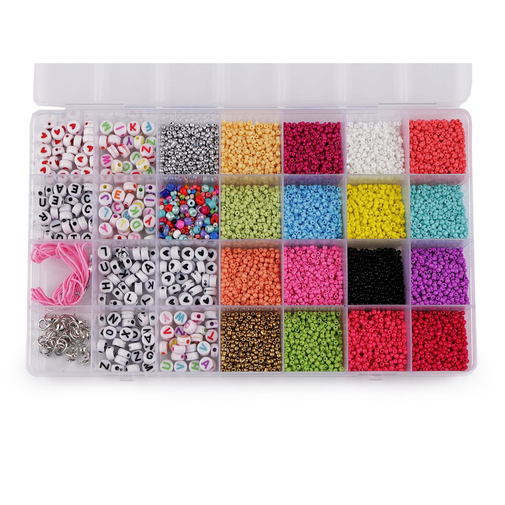 Ein Set aus Rocailles- und Kunststoffperlen in einer Box wird sowohl kleine als auch große Perlenbastler begeistern. Sie eignen sich hervorragend für die Herstellung von Armbändern und Halsketten, da die Box auch Metallanhänger enthält. Perlen mit Buchstaben, Sternen und Herzen werden Sie sicherlich begeistern. Die Box ist in 28 Fächer mit Perlen unterteilt. Das gesamte Set enthält außerdem ein Silikongummiband, eine Metallpinzette und eine Schere . 18 Fächer enthalten Rocailles in verschiedenen Farben. 4 Fächer enthalten Buchstabenperlen. 2 Fächer enthalten Herzperlen. 1 Fach enthält Sternperlen. 1 Fach enthält Perlen, Würfel mit Bildern. 1 Fach enthält transparente Perlen. 1 Fach enthält Modeschmuckkomponenten – Metallanhänger und Verbindungsringe.
