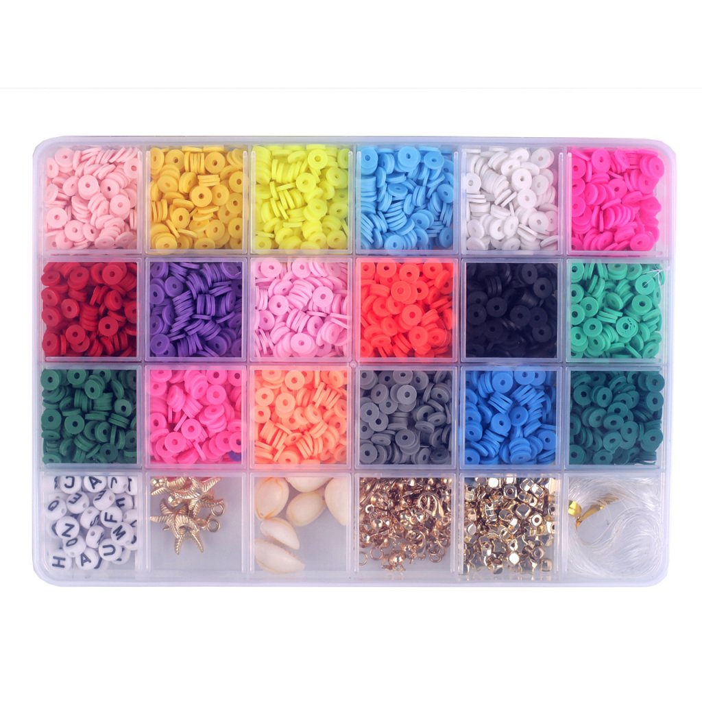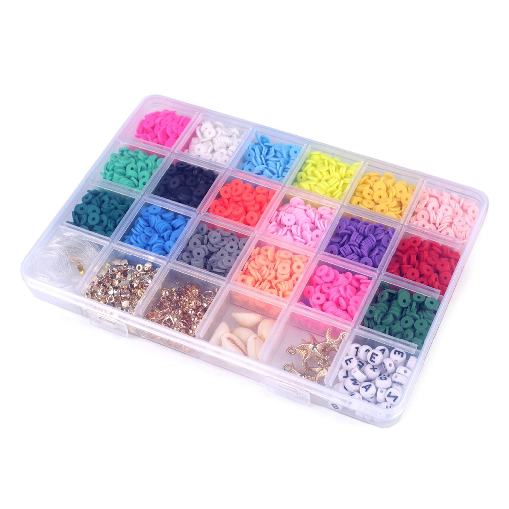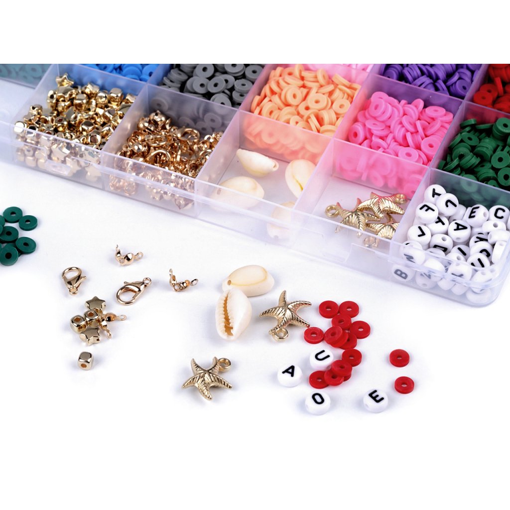 Ein Set aus Silikonpasteten und Kunststoffperlen und -anhängern in einer Schachtel eignet sich hervorragend für die Herstellung von Armbändern und Halsketten, da die Schachtel auch Schmuckkomponenten und Gummibänder zum Auffädeln enthält. Die Box ist in 24 Fächer unterteilt. 18 Fächer enthalten Silikonpatties in verschiedenen Farben. 1 Fach enthält Perlen mit Buchstaben. 1 Fach enthält eine Mischung aus metallischen Sternen, Kreisen und Würfeln. 1 Fach enthält Schmuckkomponenten - Karabiner und Verbindungsringe. 1 Fach enthält Sternanhänger. 1 Fach enthält Muschelanhänger. 1 Fach enthält ein rundes Silikongummiband.