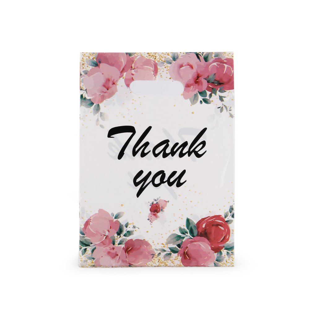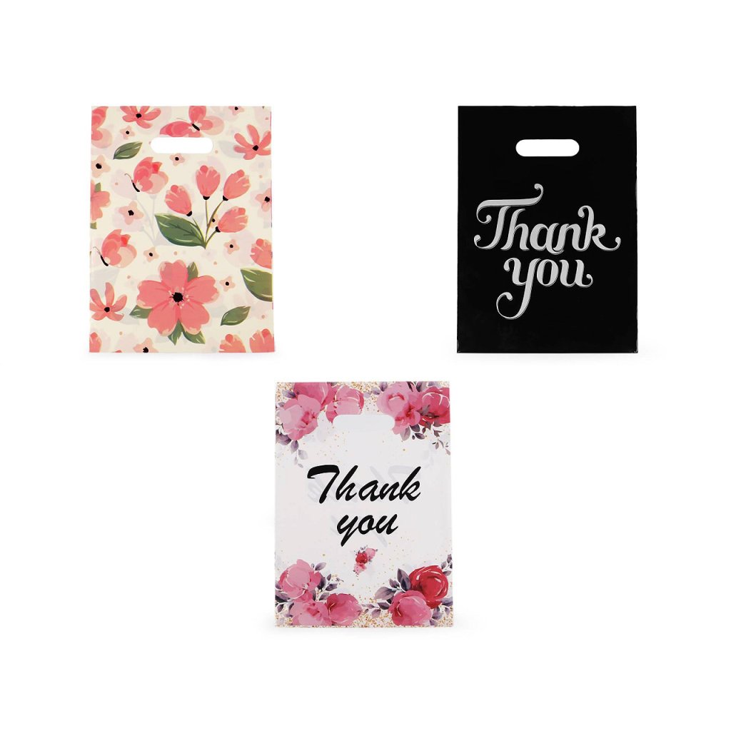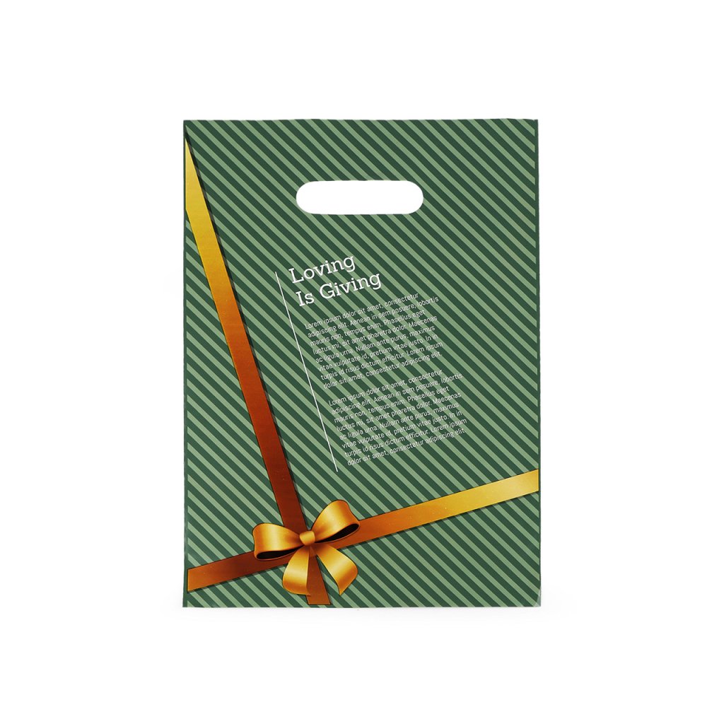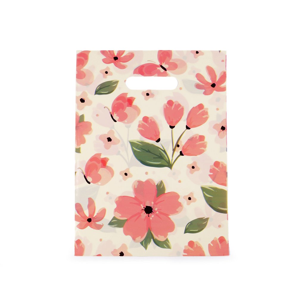 Die Plastiktüte ist auf beiden Seiten mit einem Designdruck verziert. Es eignet sich für Geschäfte zum Verpacken kleinerer Einkäufe (Kosmetik, Unterwäsche, Schmuck usw.).