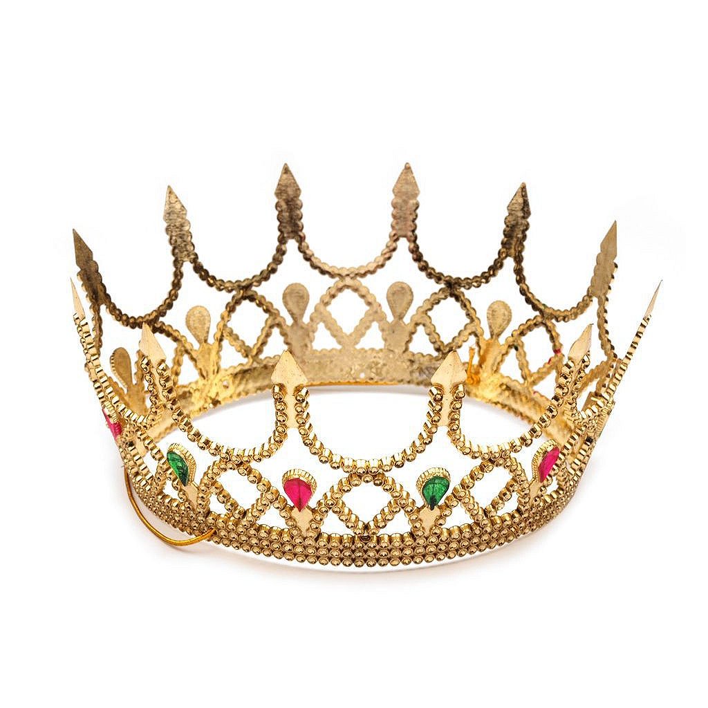 Diese Krone besteht aus zwei Teilen, die einfach zusammengesteckt werden können. Im Lieferumfang ist außerdem ein elastisches Gummiband für besseren Halt am Kopf enthalten. Die Krone besteht aus Kunststoff und ist mit einer Bemalung und einem runden Muster verziert, das Lichtreflexionen erzeugt. Es ist leicht. Abmessungen: Durchmesser der Krone beträgt 14 cm, Umfang 48 cm, Höhe 8,5 cm. Die goldene Farbe kann verschiedene Schattierungen haben. Die goldene Farbe kann in verschiedenen Farbtönen vorliegen. Auch die Farbe der Steine kann unterschiedliche Schattierungen aufweisen.