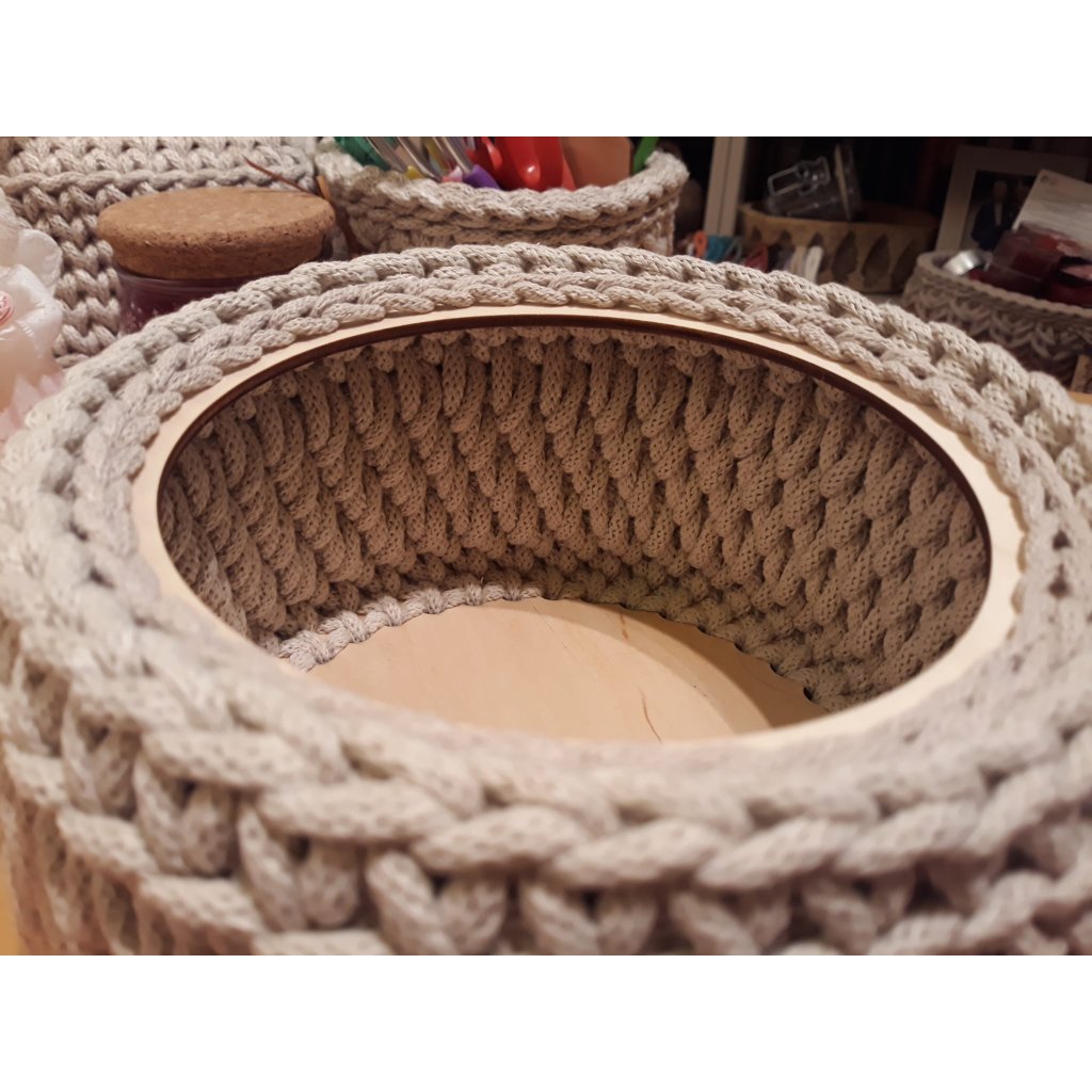 Der Ring wird in unserer Werkstatt mit Lasertechnik hergestellt. Dadurch ist der Holzboden präzise und Sie erhalten eine gleichmäßige Form Ihrer maßgefertigten Häkelkörbe.