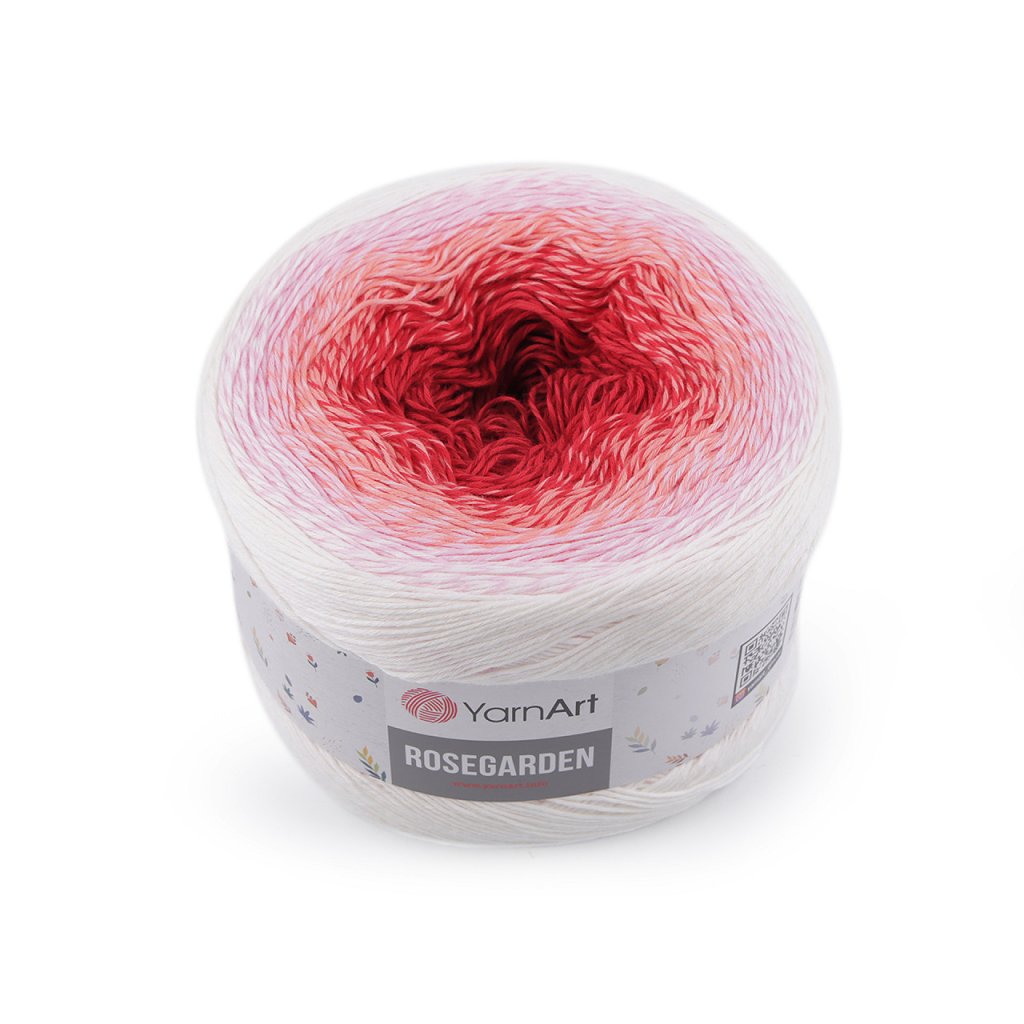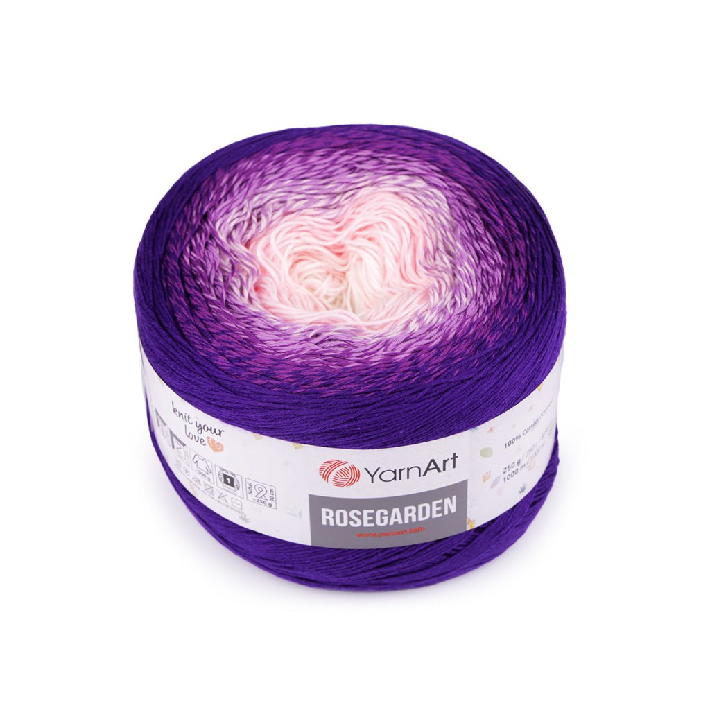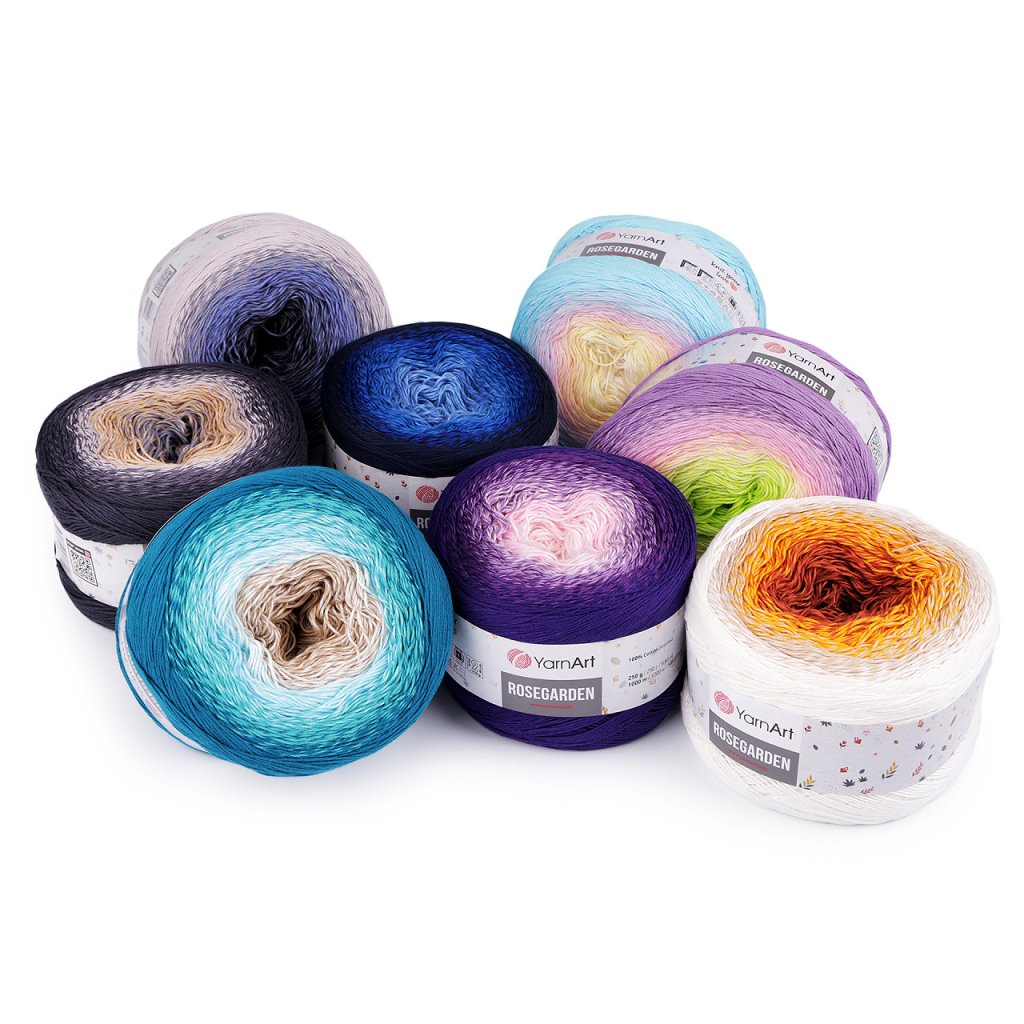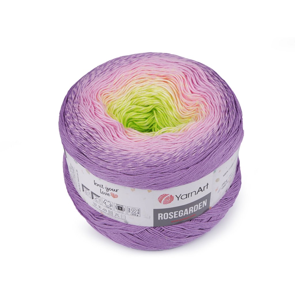 Rosegarden Baumwollstrickgarn ist interessant für seine Farbübergänge , mit denen alle Produkte original aussehen. Es eignet sich zum Stricken und Häkeln von Plaids, Pullovern, Ponchos, Schals usw. Nadelgröße: 2.5 Hakengröße: 3