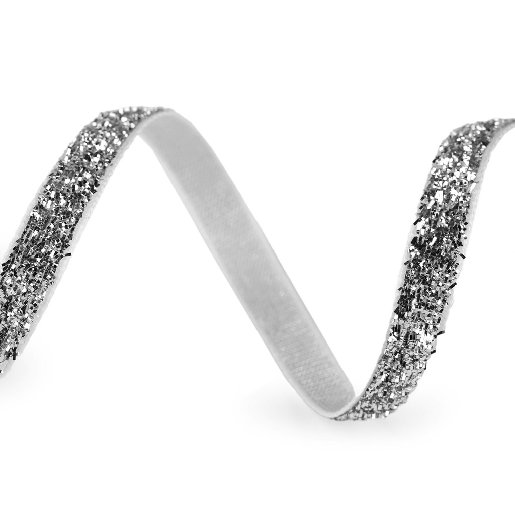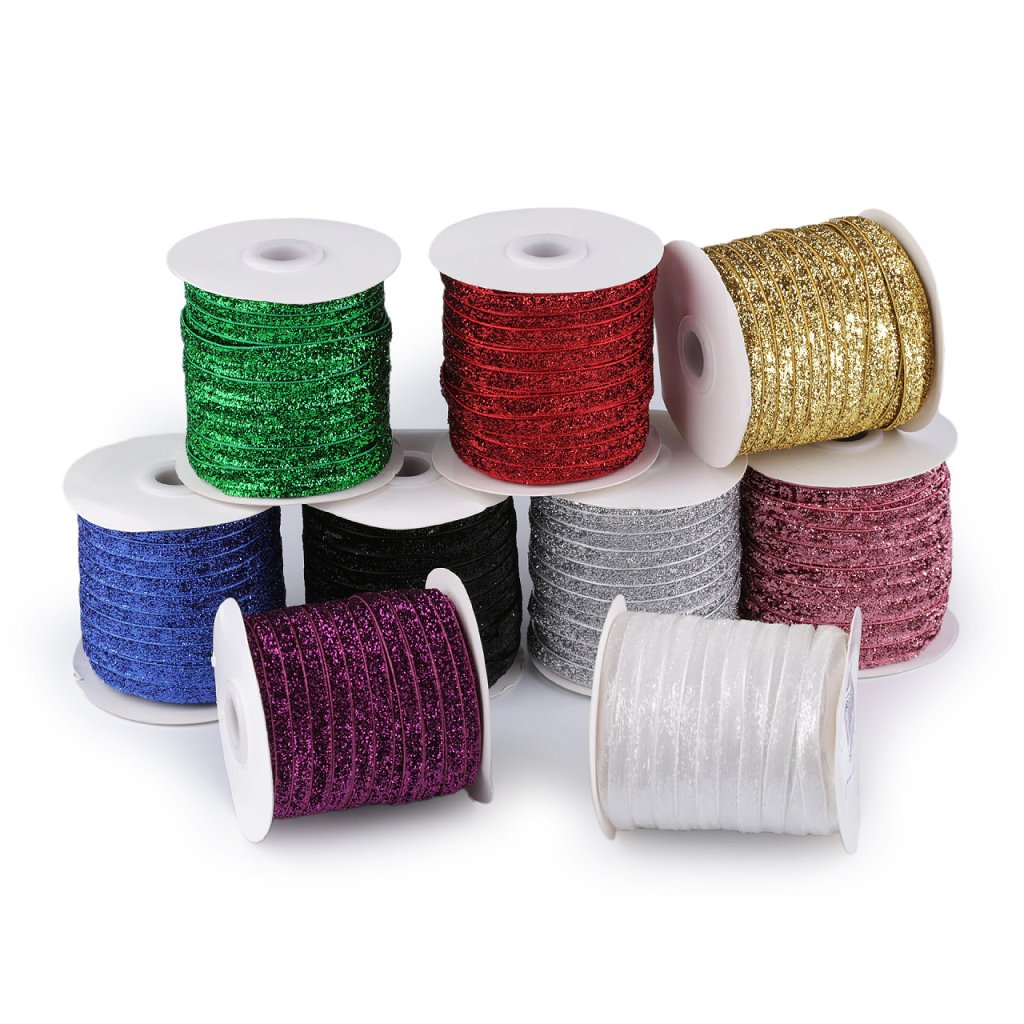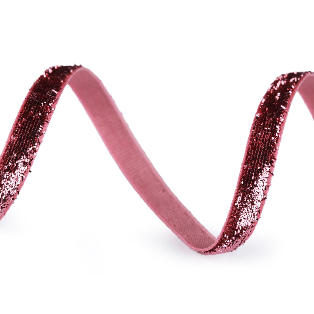 Das glitzernde Samtband ist auf der Oberseite mit Lurex versehen. Es ist sehr fest, hochwertig und einseitig. Verwendung: Sie können das Band zum Verzieren von Karnevalskostümen verwenden. Es ist bei der Herstellung von Modeschmuck beliebt, da es sehr effektvoll ist. Sie können damit Stirnbänder und Halsketten, Halsbänder oder Armbänder herstellen. Sie können es auch zu Dekorationszwecken verwenden, es eignet sich auch für unkonventionelle, aber eindrucksvolle Geschenkverpackungen.