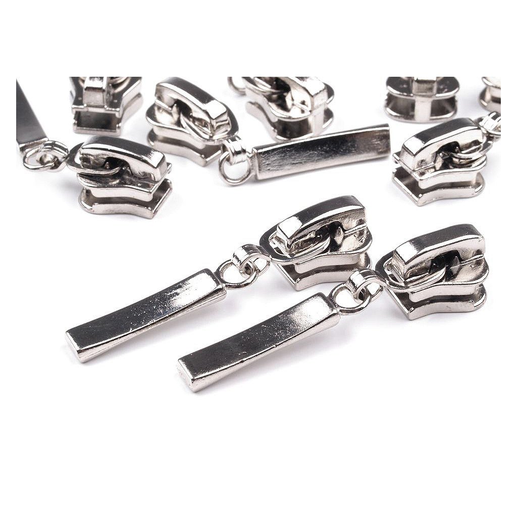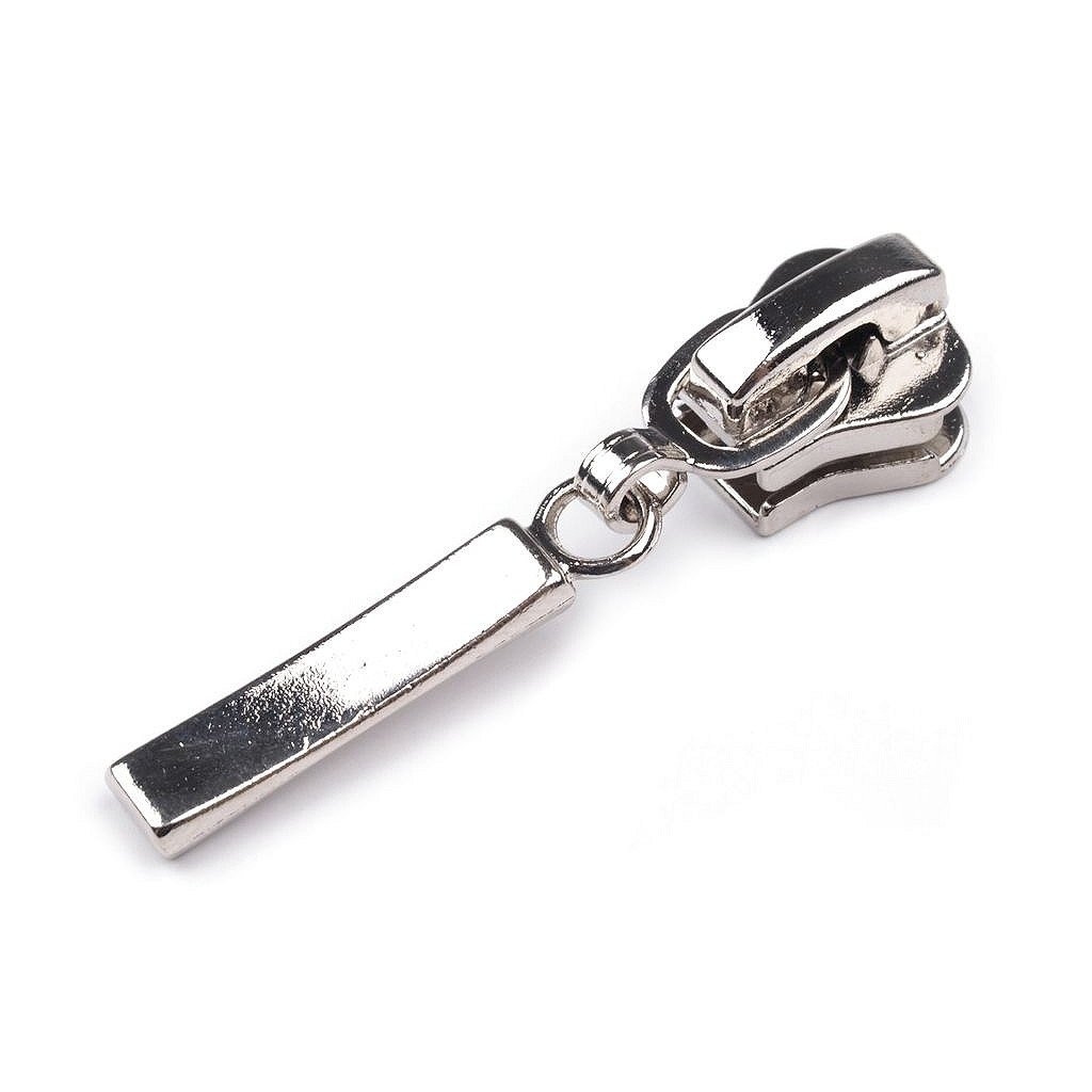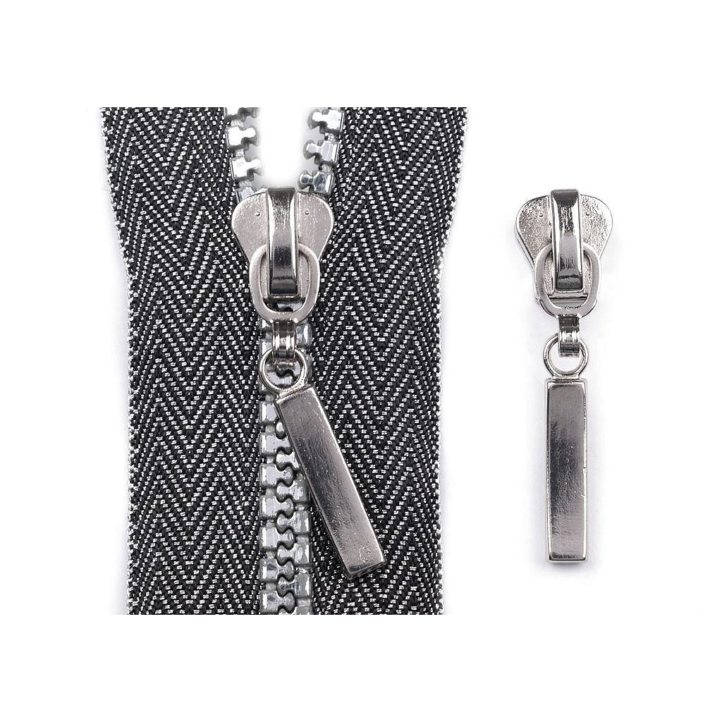Metallschieber für dekorativen Reißverschluss aus Kunststoff. Dieser Schieber bleibt an Ort und Stelle und öffnet sich nur so weit, wie Sie möchten. Meterweise verkaufte Reißverschlüsse finden Sie unter den Codes 090847, 790837 und 750994.
