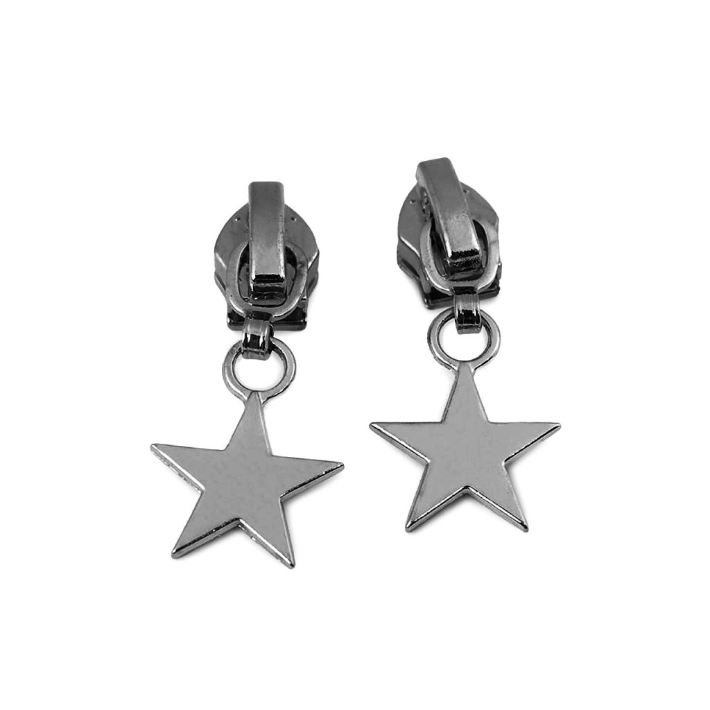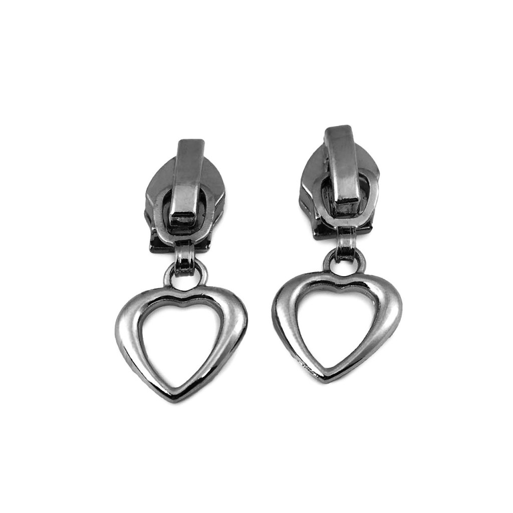 Der Metallschieber hat einen Griff mit Herz-, Stern- oder Blumenmotiv . Er ist für Spiralreißverschlüsse vorgesehen , die unter den Codes 800963, 790304 zu finden sind .