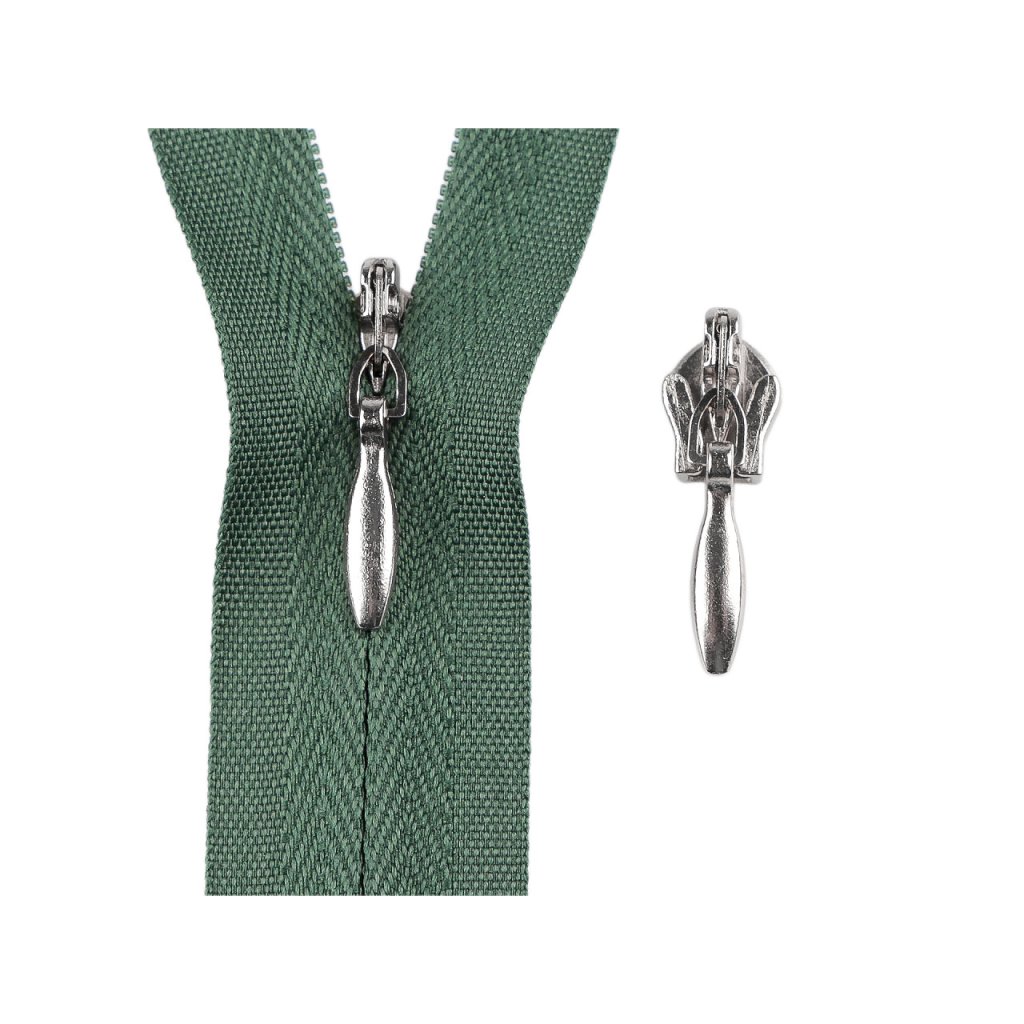 Der Metallschieber ist für nahtlose Nylonreißverschlüsse Nr. 3 (Meterware) konzipiert. Dank des automatischen Verriegelungsmechanismus bietet er einen zuverlässigen Halt und verhindert so ein unbeabsichtigtes Öffnen des Reißverschlusses. Der Schieber selbst ist unauffällig, minimalistisch gestaltet und beeinträchtigt das Gesamtbild des Produkts nicht.