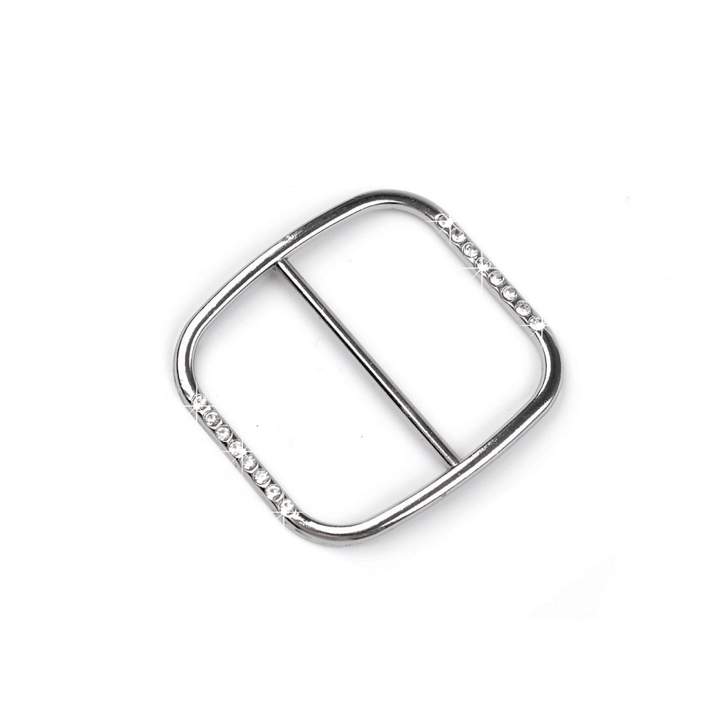 Die Metallschnalle ist stellenweise mit funkelnden Strasssteinen besetzt, wodurch sie elegant wirkt. Es wird als Dekoration für Ball- und Abendkleider oder Accessoires hervorstechen.