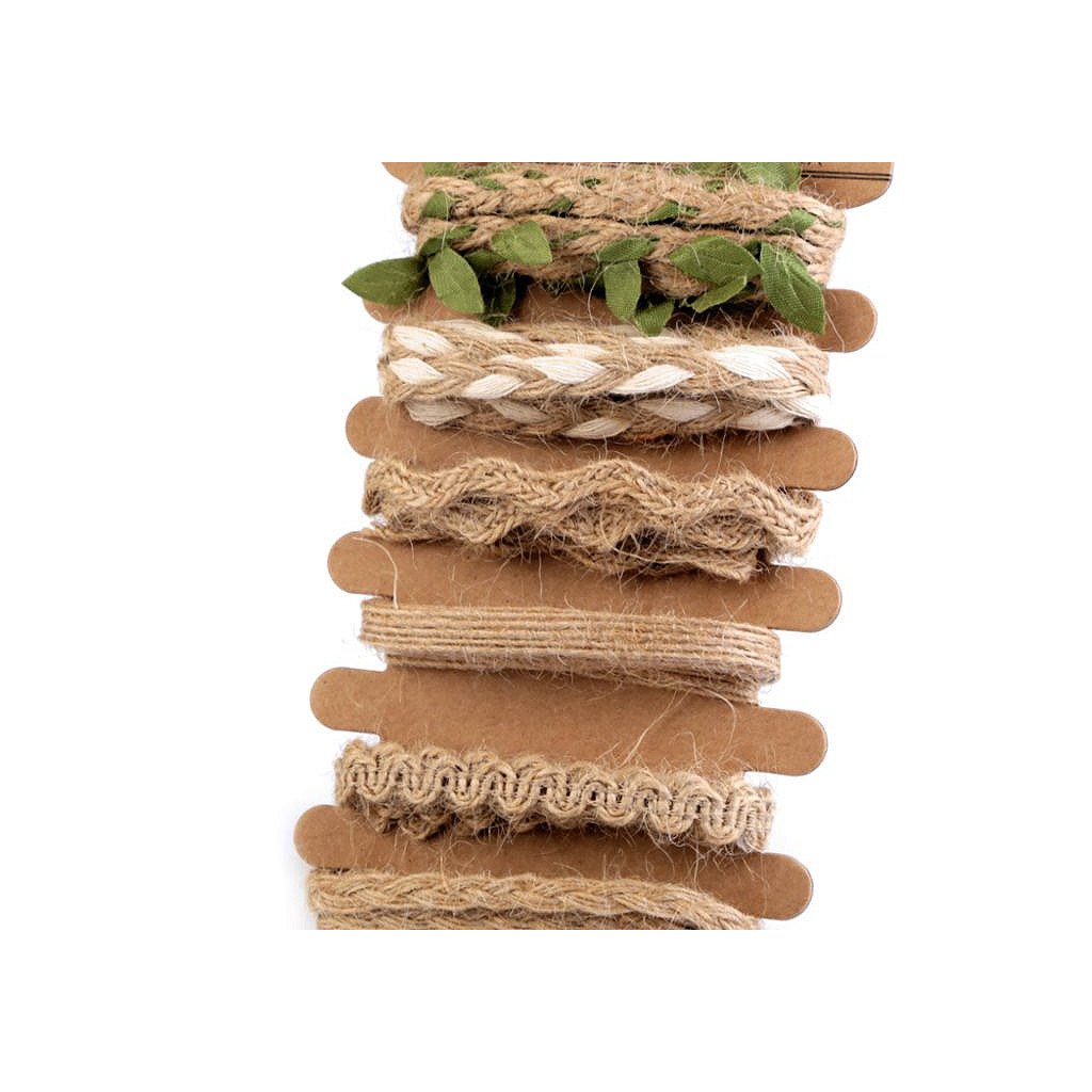 Set von Schnürchen aus Jute besteht aus 6 verschiedenen Typen von Jutebindfaden - jeder im Wickel nach 1 m. Ideal für Verpackung und Dekoration der Geschenke, auf Kränze, Blumenarrangements usw.