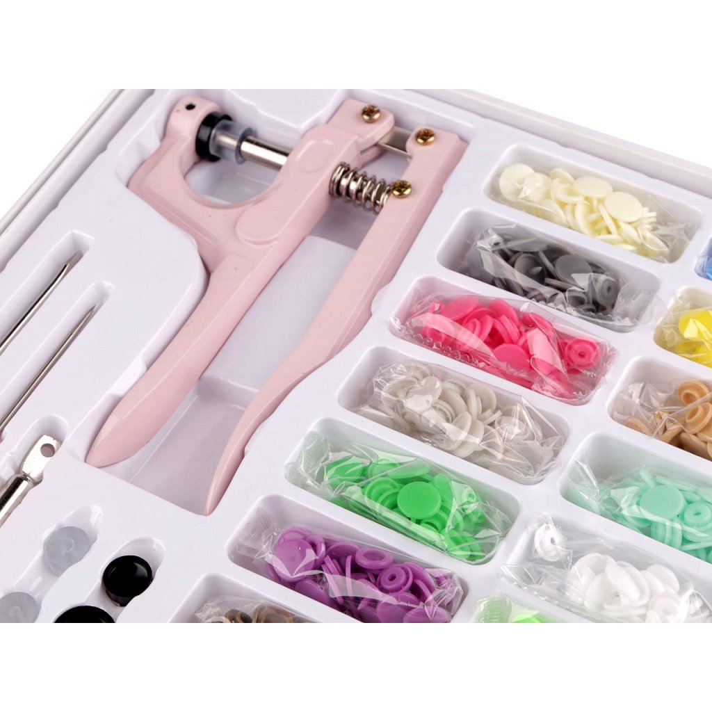 Druckknopf-Set mit Handpresse und Zubehör. Mit den Druckknöpfen aus Kunststoff können Sie Kleidung und Accessoires verschließen. Die Anbringung erfolgt mit einem Handblatt. Im Set findest du Druckknöpfe in 16 Farben zu je 10 Paar. Die Größen der Druckknöpfe können Sie dieser Tabelle entnehmen.