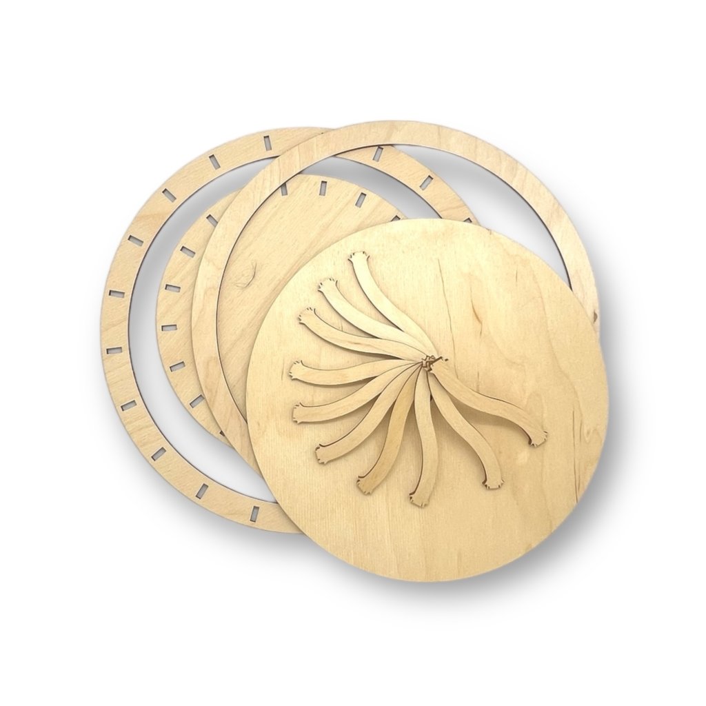 Das Set enthält die Konstruktion, einen zusätzlichen Ring zum Abdecken der Löcher, einen Holzdeckel und einen Holzknopf. Jetzt müssen Sie nur noch die richtige Garnfarbe auswählen.