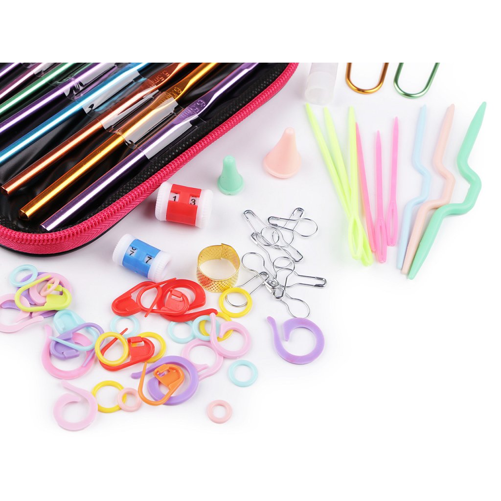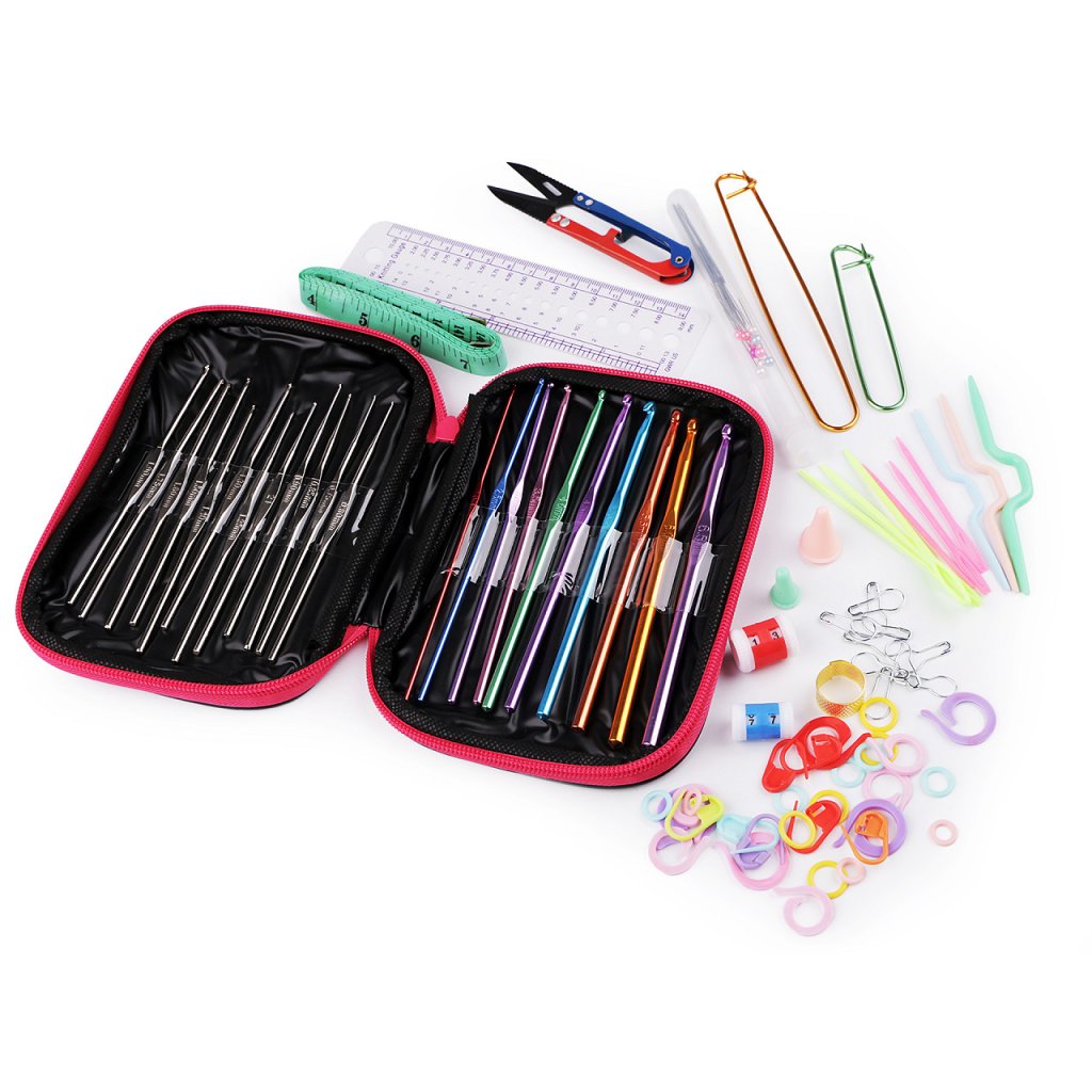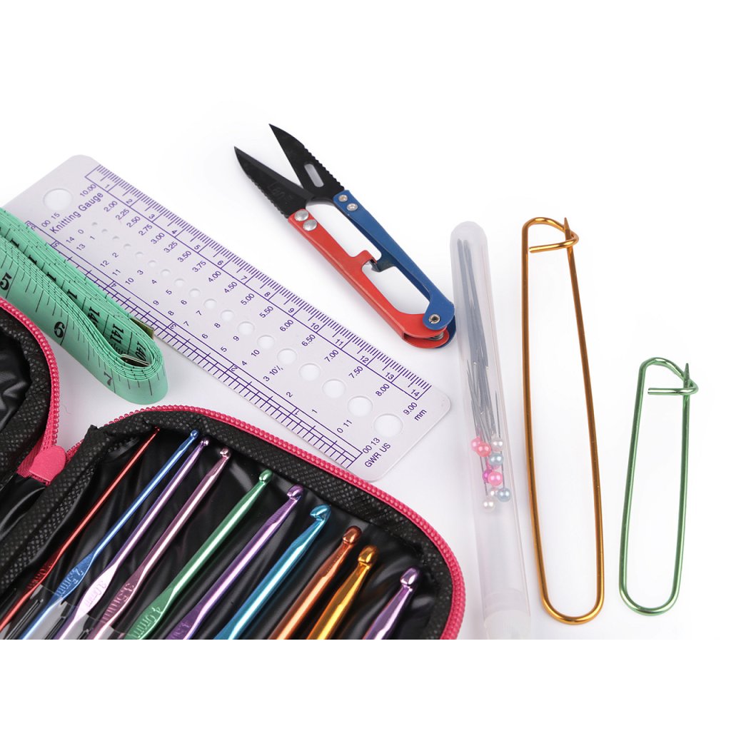 Das Set aus Häkelnadeln und Häkelwerkzeugen wird in einem Kunstlederetui aufbewahrt, das Sie einfach mit einem Reißverschluss schließen können.