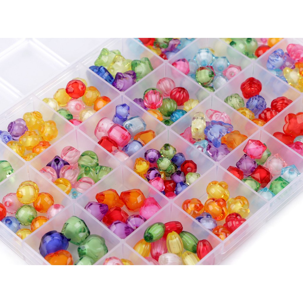 Ein Satz Kunststoffperlen in einer Schachtel wird kleine und große Perlen begeistern. Einzigartig sind sie nicht nur durch ihre unterschiedlichen Formen , sondern vor allem durch ihre Transparenz und Oberflächen, die sehr auffällige Lichtreflexe erzeugen. Sie können sie für verschiedene Perlentechniken verwenden, zB um Halsketten und Armbänder herzustellen, sie werden in Perlenbehängen umwerfend sein. Ihr großer Vorteil ist ihr geringes Gewicht . Die Box ist in 24 Fächer unterteilt. Insgesamt enthält es etwa 220 Perlen . Wir listen diese Formen nach dem Zufallsprinzip auf - rund, Oliven, Schmetterlinge, Blumen, Sterne, Herzen und mehr.