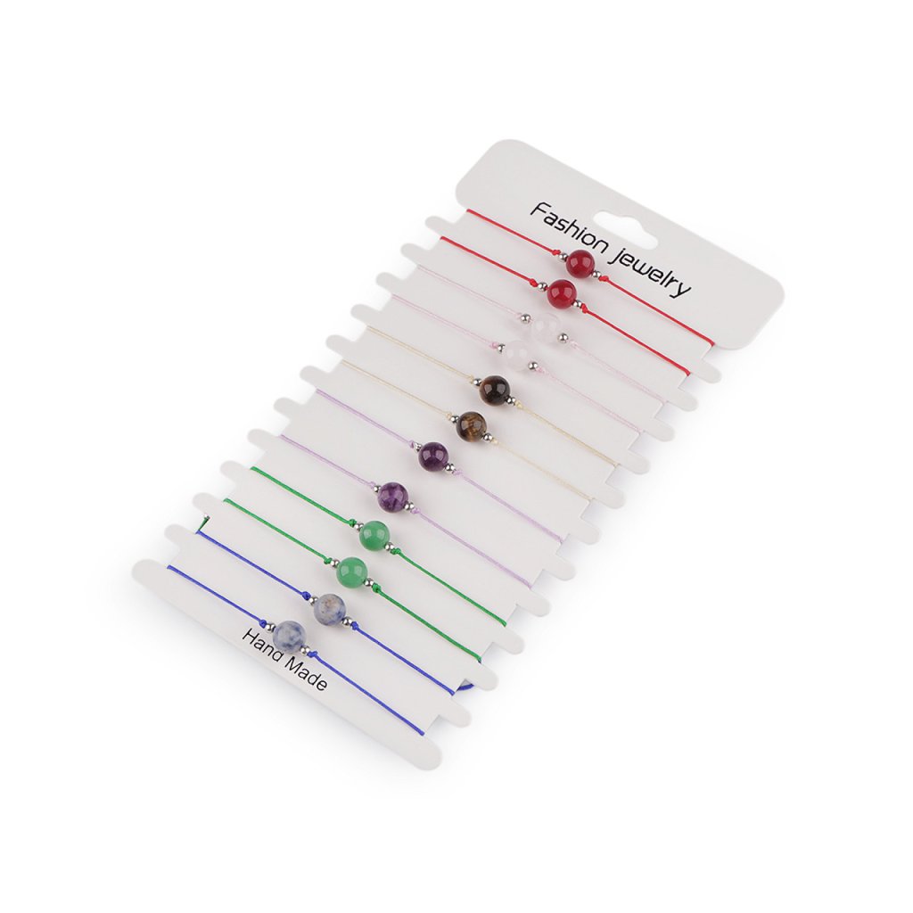 Das Shamballa-Armband mit Mineral ist die ideale Wahl für alle, die ein bequemes und zugleich attraktives Schmuckstück suchen. Es schmückt Ihr Handgelenk mit Kleidern, Blusen, T-Shirts und Badeanzügen. Tragen Sie es allein für einen dezenten Look oder kombinieren Sie es mit anderen Armbändern für einen auffälligeren Effekt. Das Armband besteht aus einer einfachen Kordel und hat einen Schiebeverschluss . Beide Enden des Armbands verlaufen durch einen Makramee-Verbinder, der das Festziehen der Kordeln ermöglicht. Dadurch hat das Armband eine universelle Größe. Der Verkauf erfolgt im 12er-Set auf einer Papierkarte zum Aufhängen, siehe Foto. Die Armbänder Nr. 9 und 10 enthalten ein synthetisches Mineral.