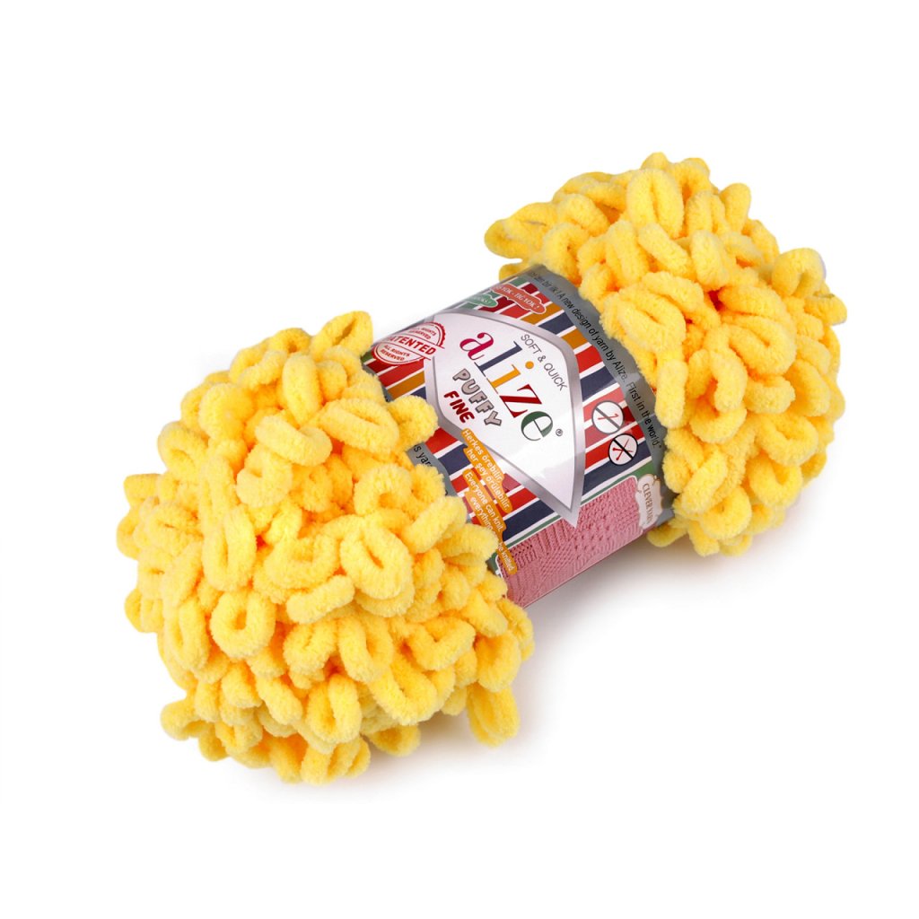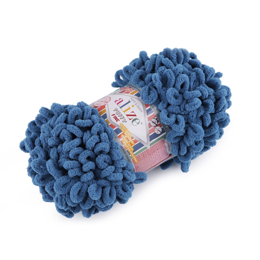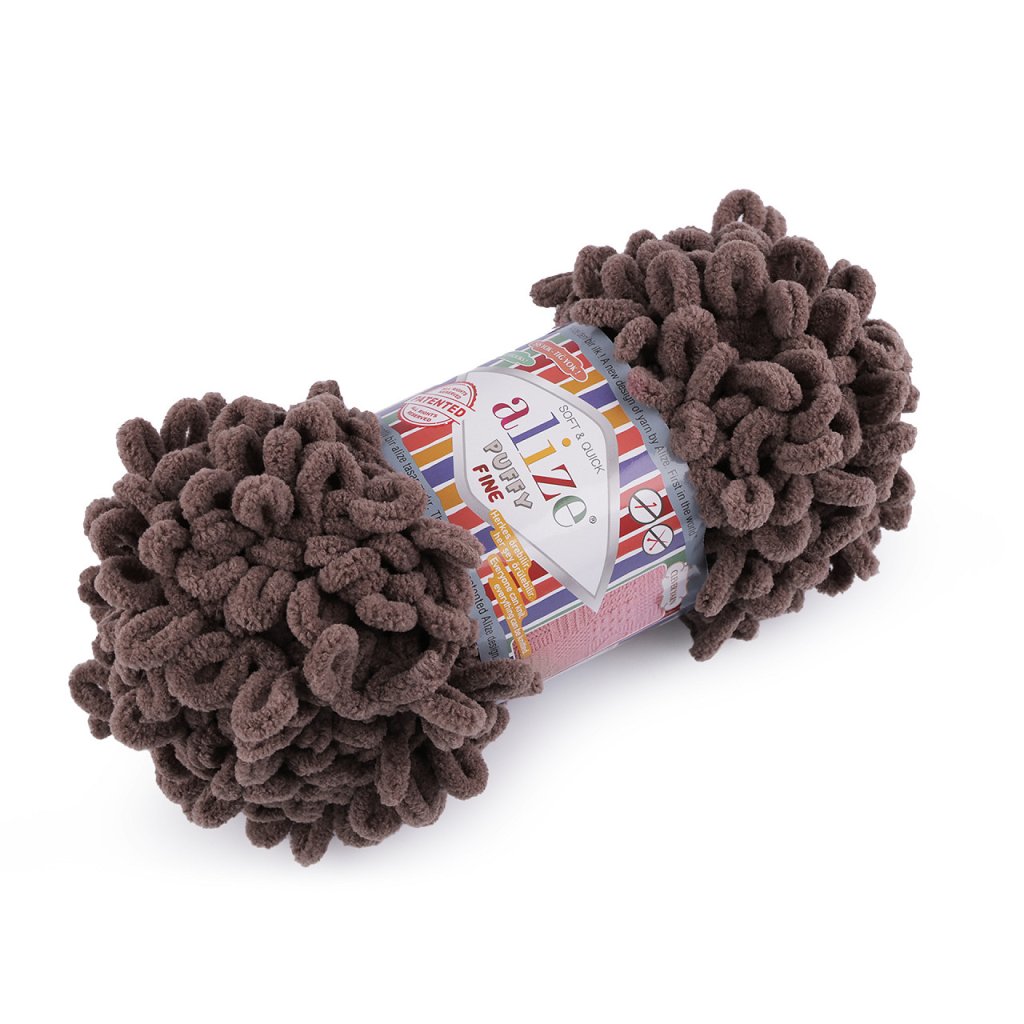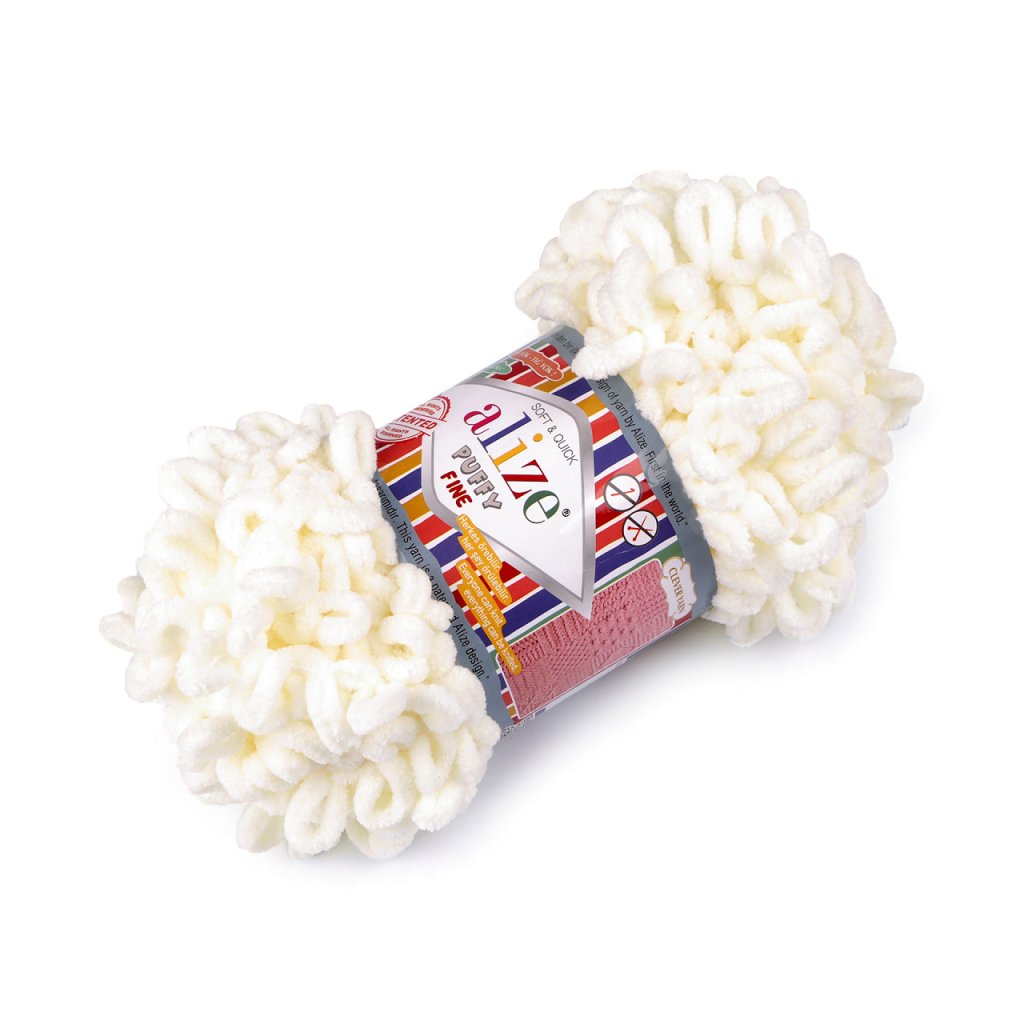 Alize Puffy Fine ist ein weiches, haariges Chenillegarn mit großen Schlaufen. Zum Stricken benötigen Sie weder Nadel noch Haken – die einzelnen Maschen werden von Hand miteinander verflochten. Es eignet sich zum Stricken von Decken, Schals usw. Ungefährer Verbrauch auf einer Decke mit den Maßen 100 x 100 cm sind 3 Knäuel. Der ungefähre Verbrauch pro Schal beträgt 1 Knäuel. Das Muster auf dem Foto wurde mit 1 Knäuel gestrickt.