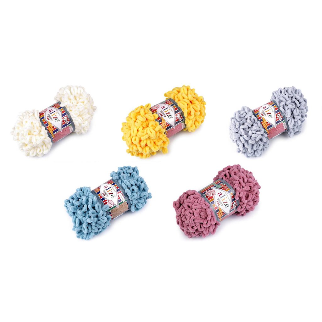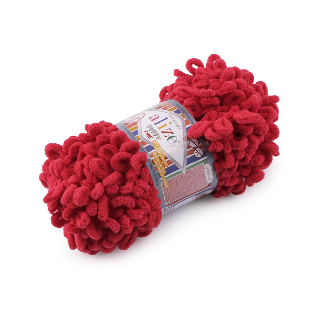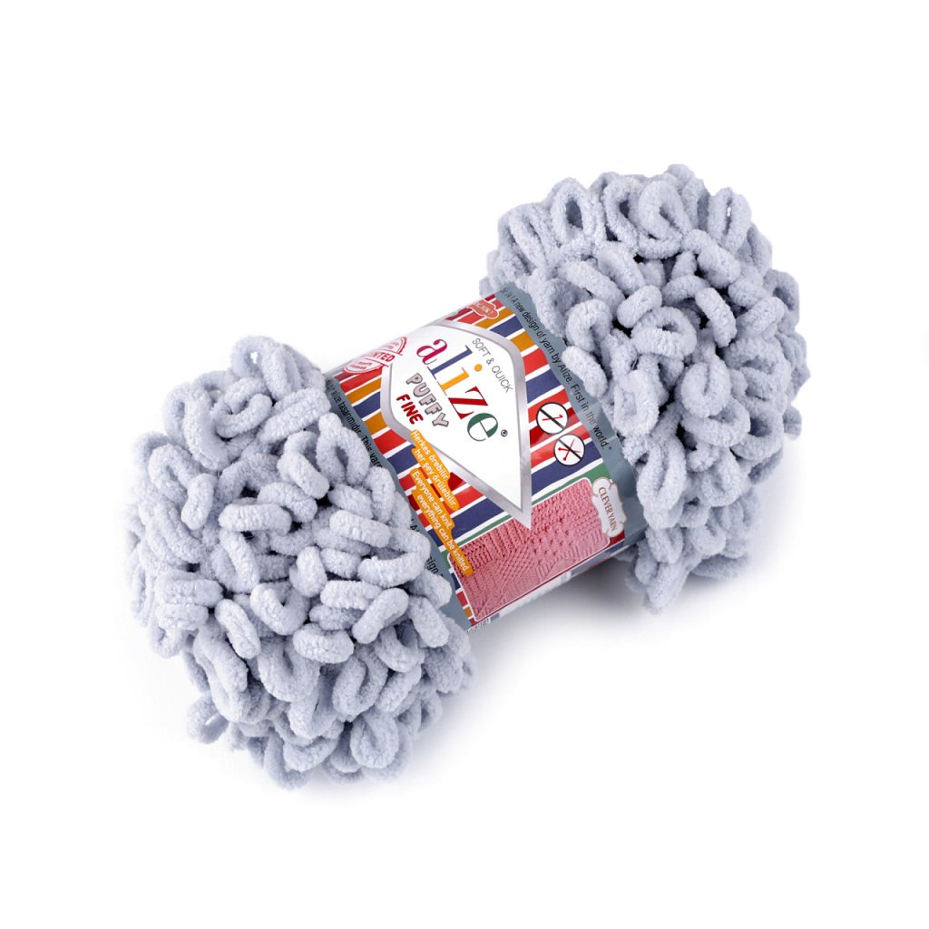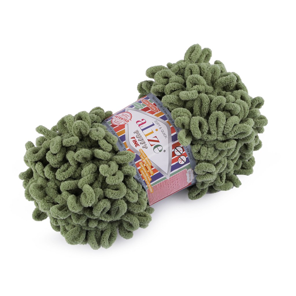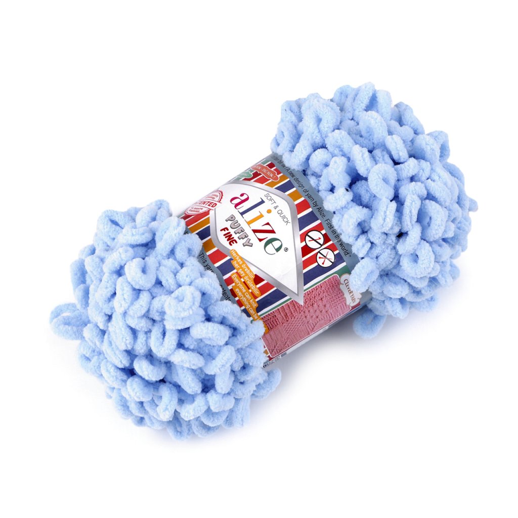 Alize Puffy Fine ist ein weiches, haariges Chenillegarn mit großen Schlaufen. Zum Stricken benötigen Sie weder Nadel noch Haken – die einzelnen Maschen werden von Hand miteinander verflochten. Es eignet sich zum Stricken von Decken, Schals usw. Ungefährer Verbrauch auf einer Decke mit den Maßen 100 x 100 cm sind 3 Knäuel. Der ungefähre Verbrauch pro Schal beträgt 1 Knäuel. Das Muster auf dem Foto wurde mit 1 Knäuel gestrickt.