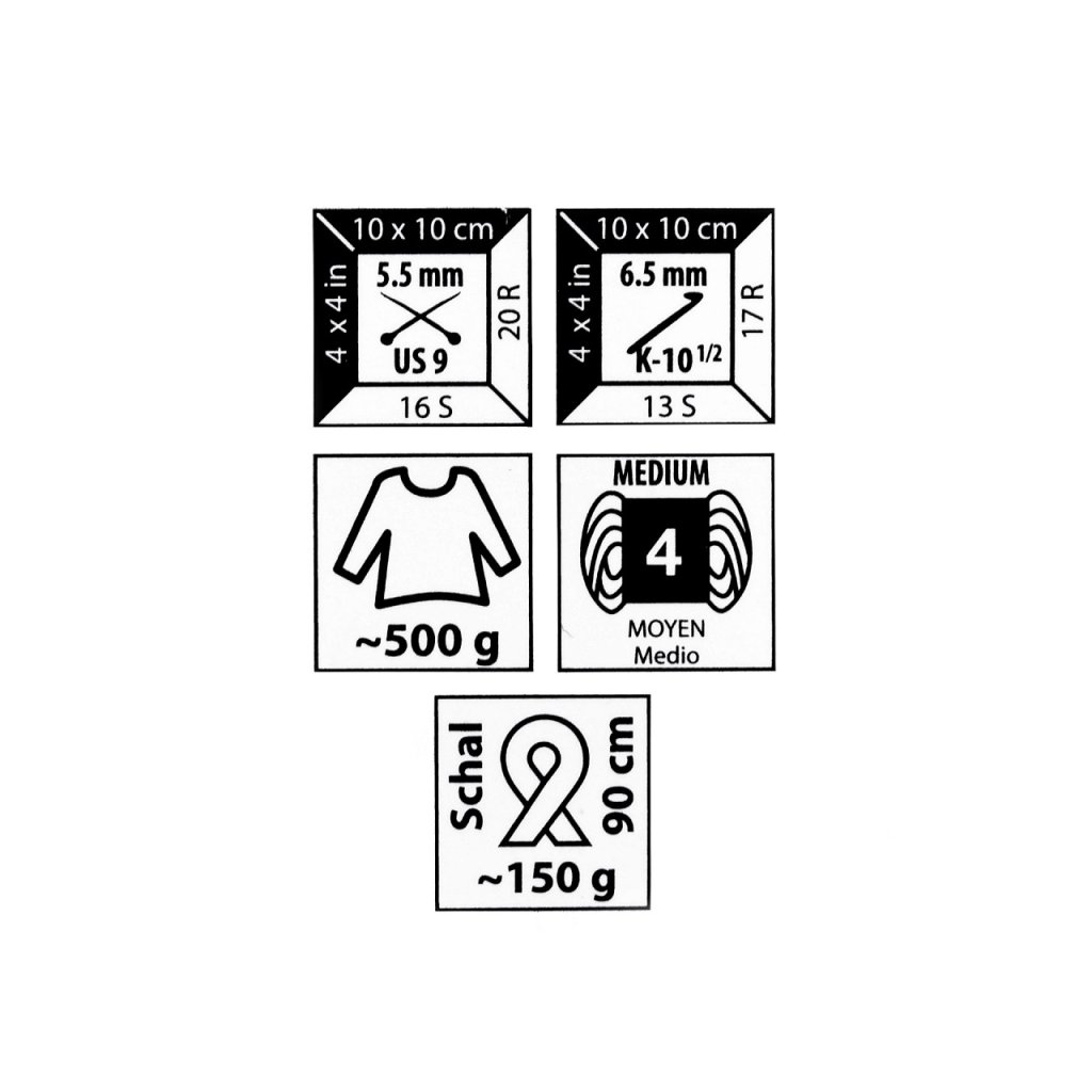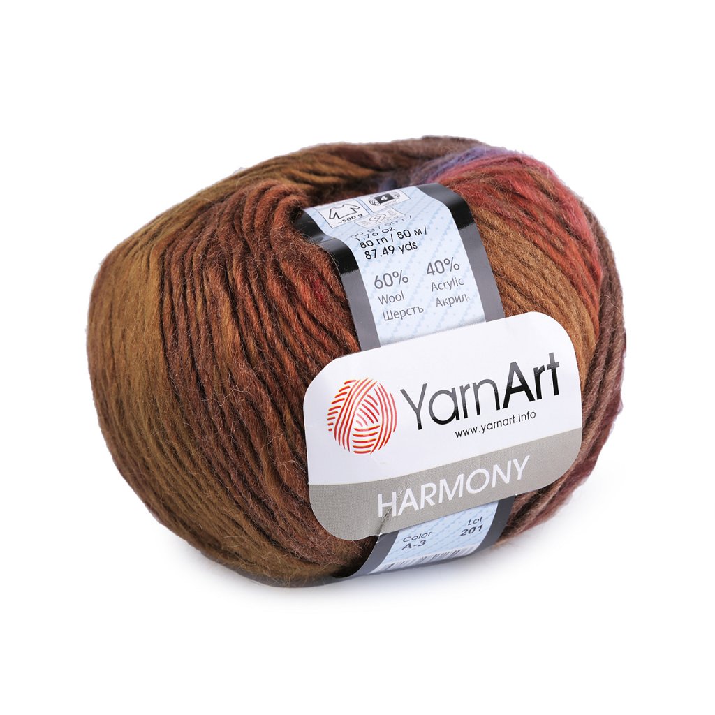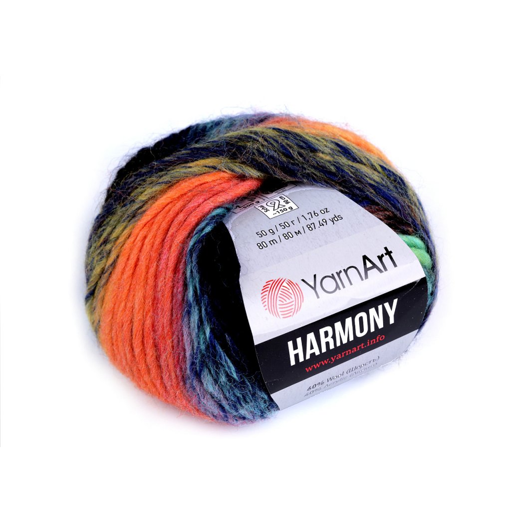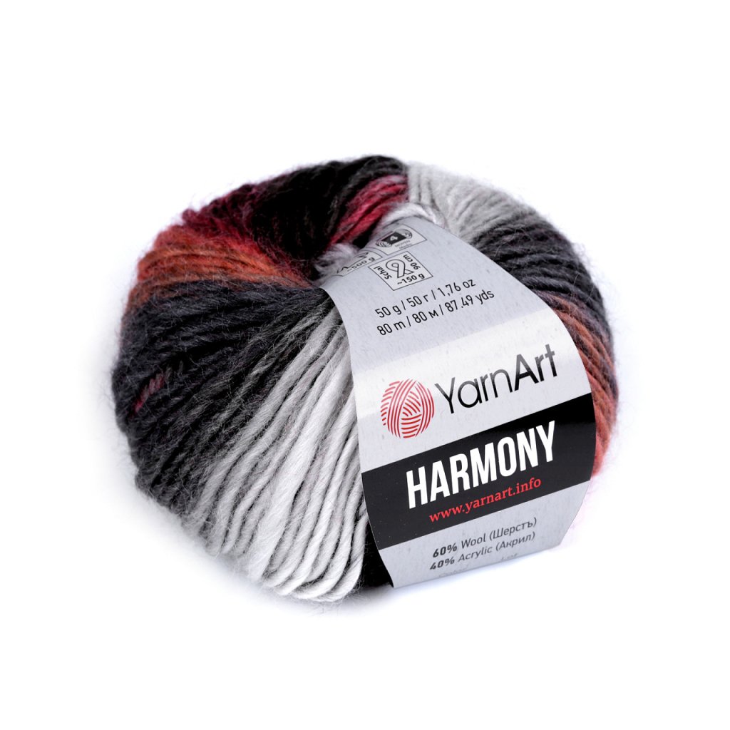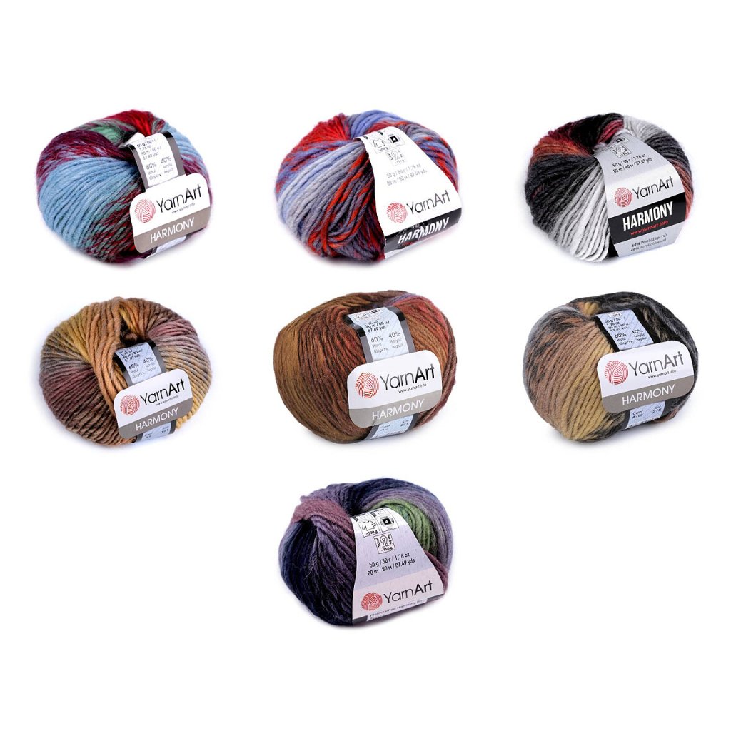 Harmony – Strickgarn , mit einem höheren Wollanteil, hat eine wirkungsvolle Akzentfarbe . Es eignet sich zum Stricken und Häkeln von Mützen, Stirnbändern, Schals, Pullovern usw. Nadelstärke: 5,5 Hakengröße: 6,5 Das Muster auf dem Foto (38 x 30 cm) wurde mit 1 Knäuel und Stricknadeln der Stärke 5,5 mm gestrickt.