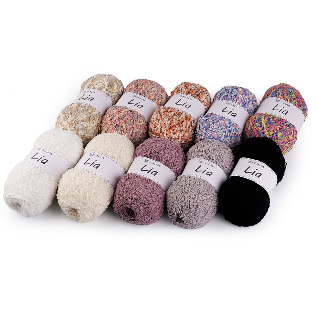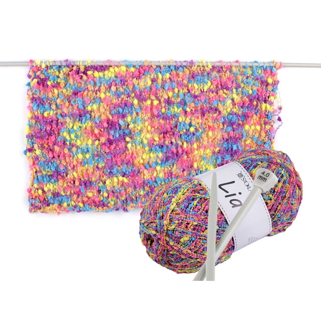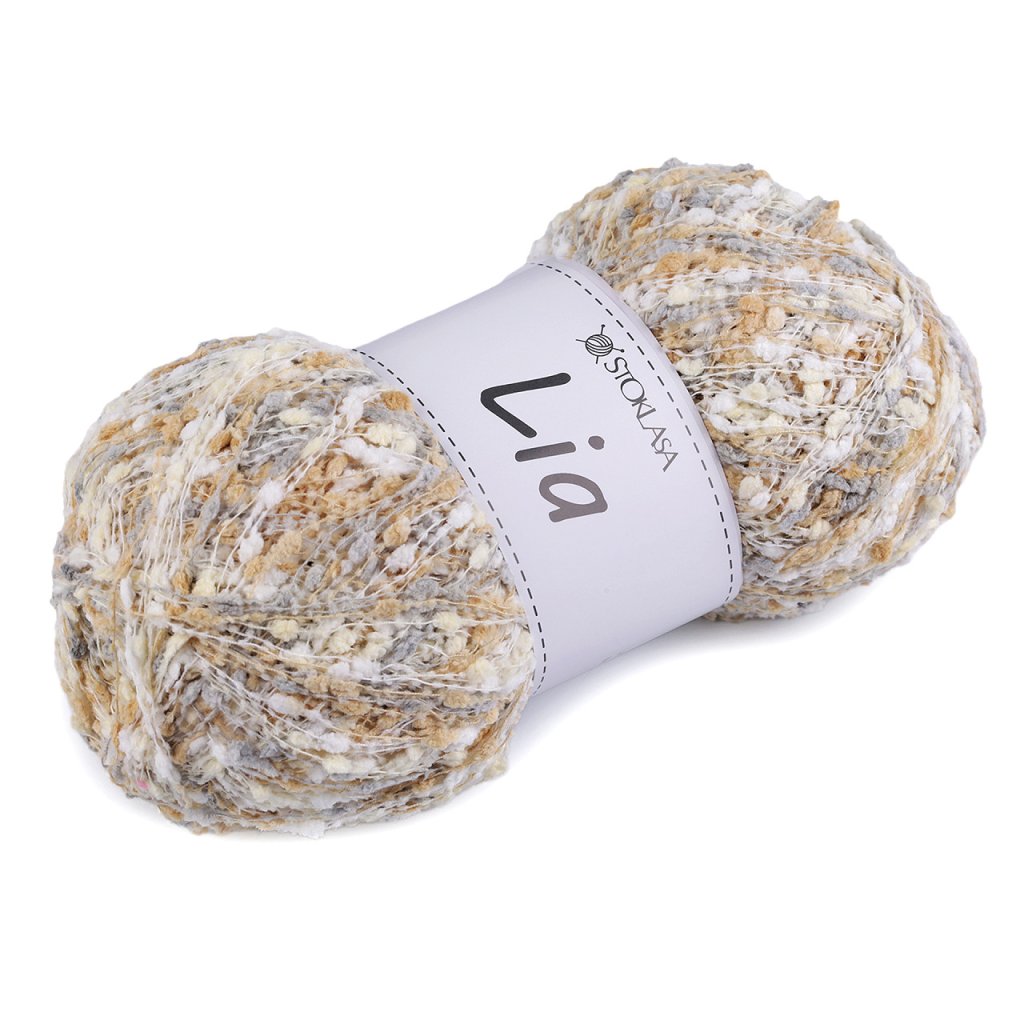 Lia-Garn fällt durch kleine Noppen auf, die dem fertigen Produkt Originalität verleihen. Sie können daraus Schals, Pullover, Westen usw. stricken. Nadelstärke: 3 - 4 Wenn Sie das Garn zerreißen möchten, müssen Sie sehr vorsichtig vorgehen, um es nicht zu beschädigen. Wir empfehlen, vor dem Stricken eine Probe zu machen.