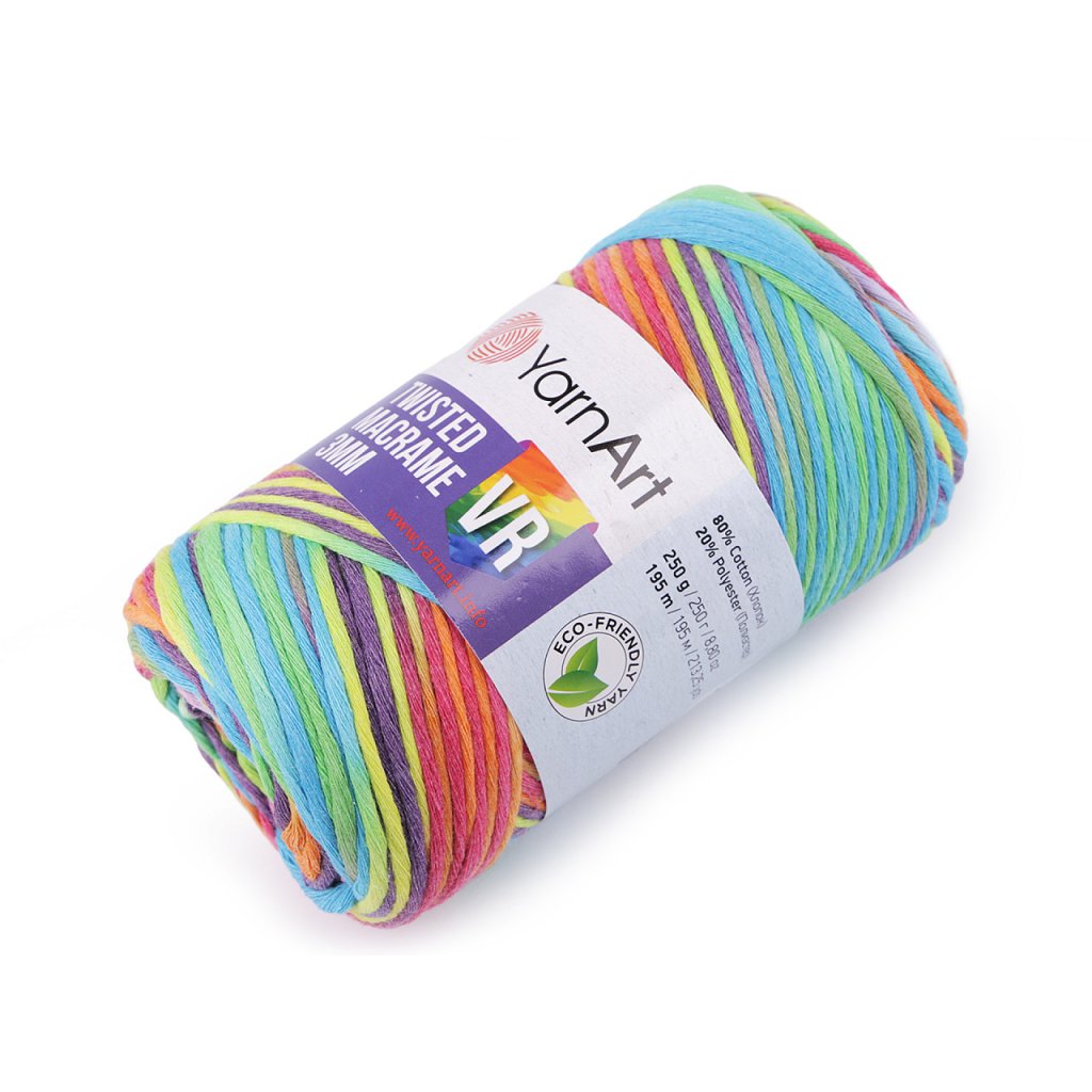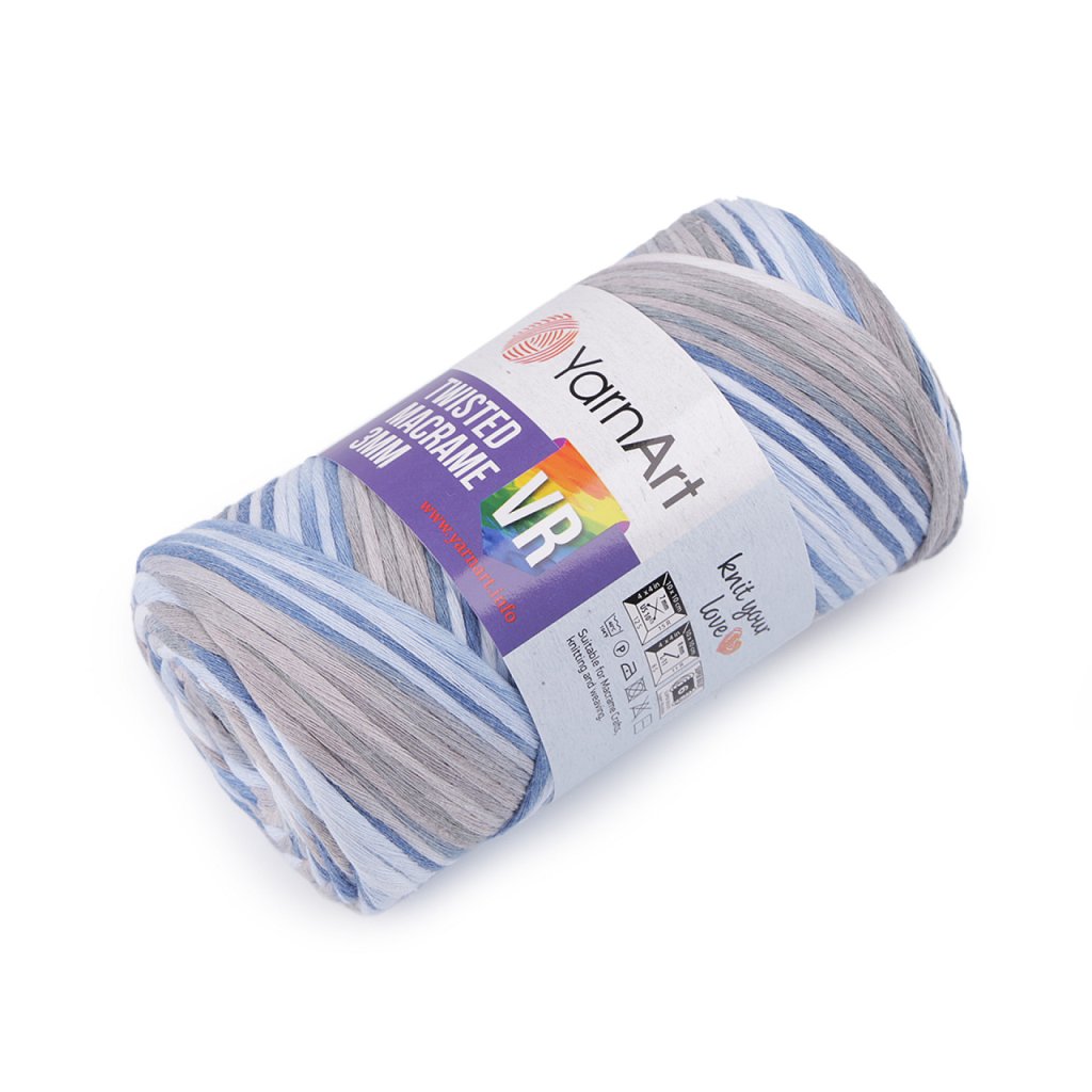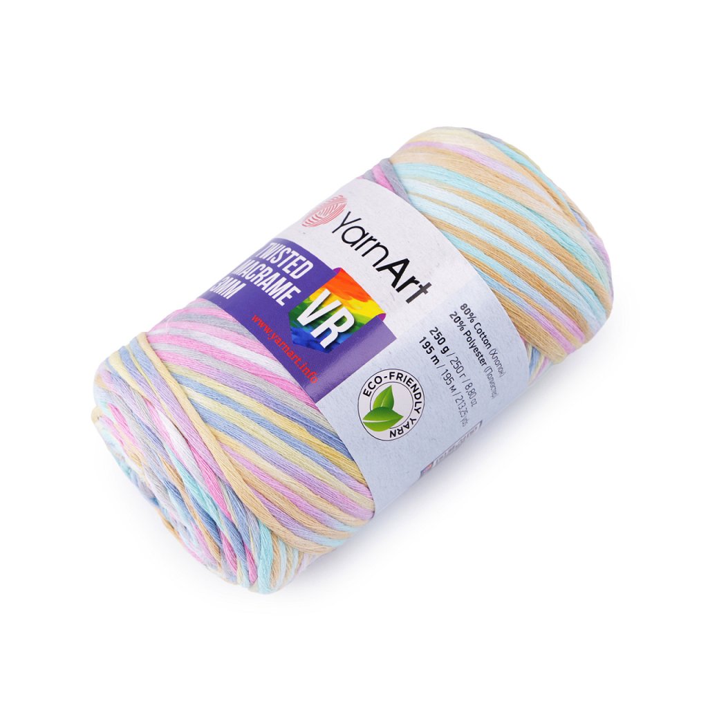 Dank seiner Verarbeitung ist Twisted Macrame ideal für die Makramee (Schrubb)-Technik , es lässt sich leicht kämmen. Es fällt durch seine farbig hervorgehobenen Übergänge auf. Sie können daraus interessante Wohnaccessoires oder hängende Dekorationen herstellen. Es eignet sich auch zum Stricken oder Häkeln von Taschen, Teppichen oder Körben. Nadelstärke: 7 Hakengröße: 8