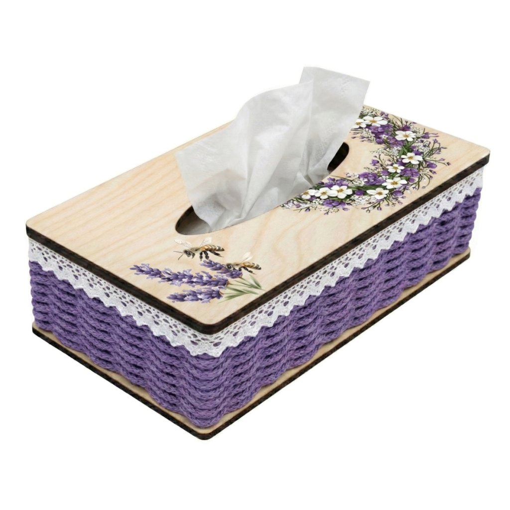 Die rechteckige Konstruktion aus natürlichem Birken-Sperrholz mit einem farbenprächtigen UV-Druck von fleißigen Bienen und duftendem Lavendel ist für ein einfaches und blitzschnelles Geflochtenes konzipiert. So schaffen Sie eine robuste und stilvolle Dekoration, die einfach auf eine einfache Papiertaschentuchbox aus dem Geschäft gesteckt wird.
