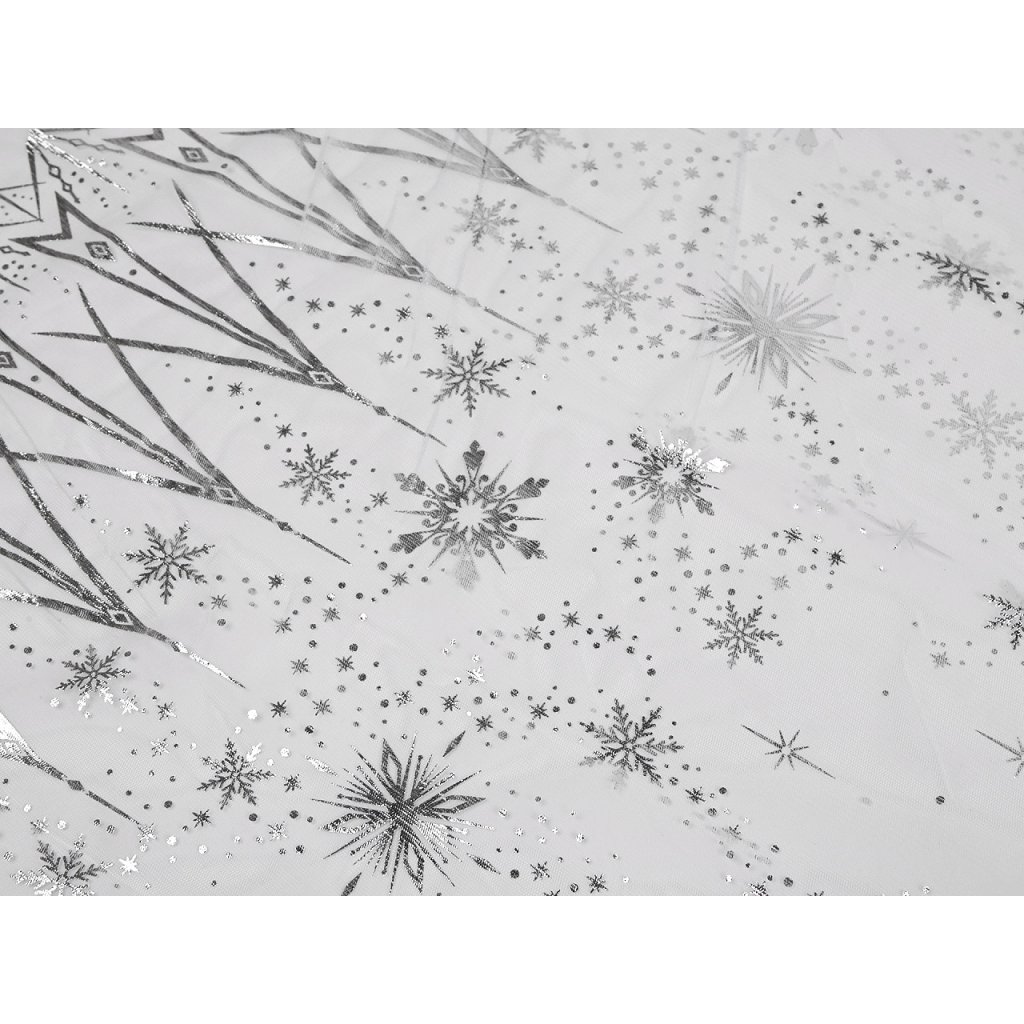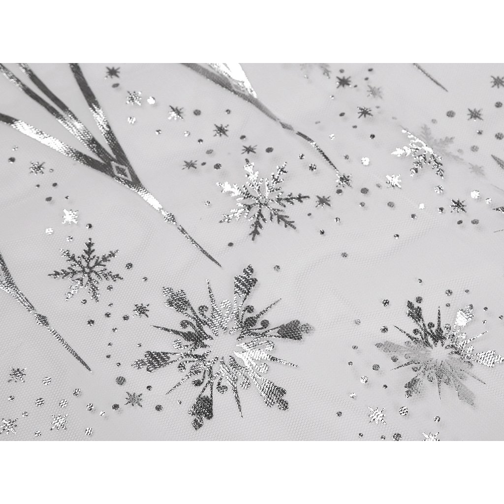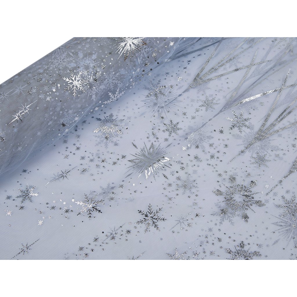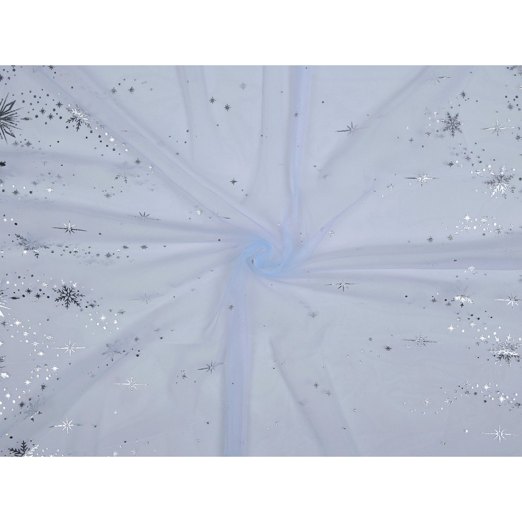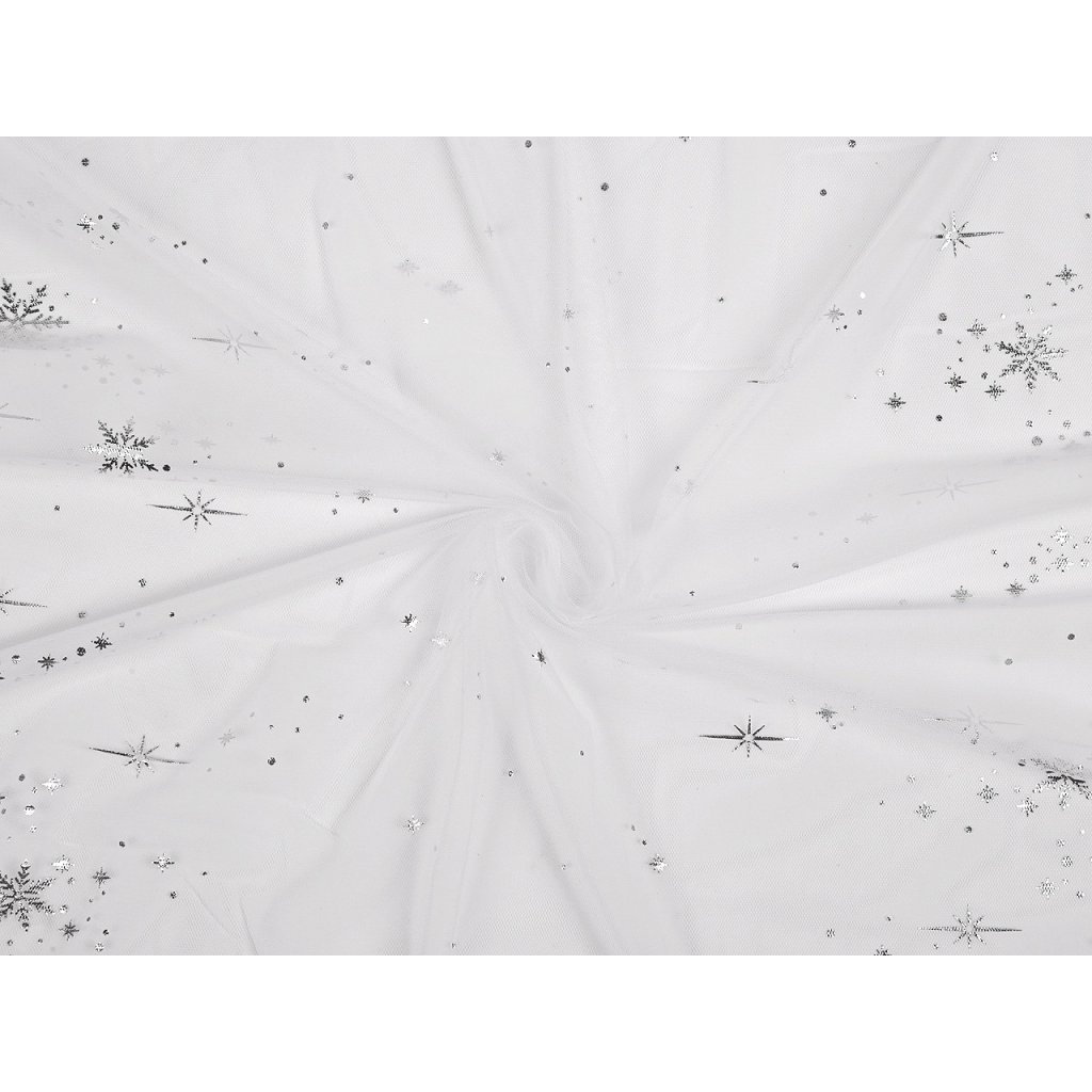 Tüll mit Schneeflocken-Print ist zart, weich und über die gesamte Breite flexibel. Sie können ihn zum Nähen von Röcken, Karnevalskostümen sowie verschiedenen Dekorationen und Winterarrangements verwenden. Der Schneeflocken-Print ist glänzend und befindet sich über die gesamte Breite auf beiden Seiten .