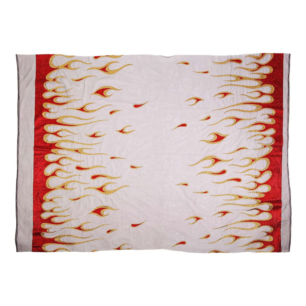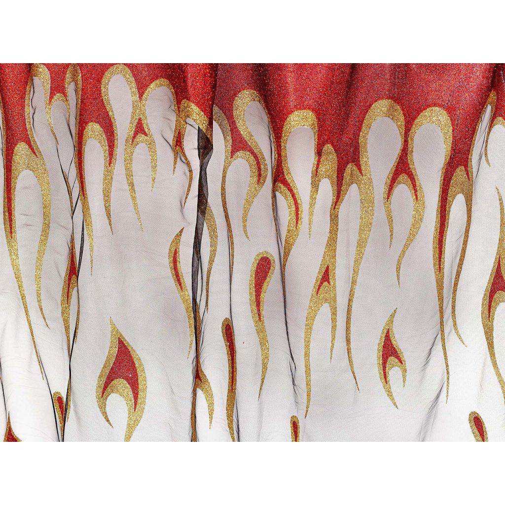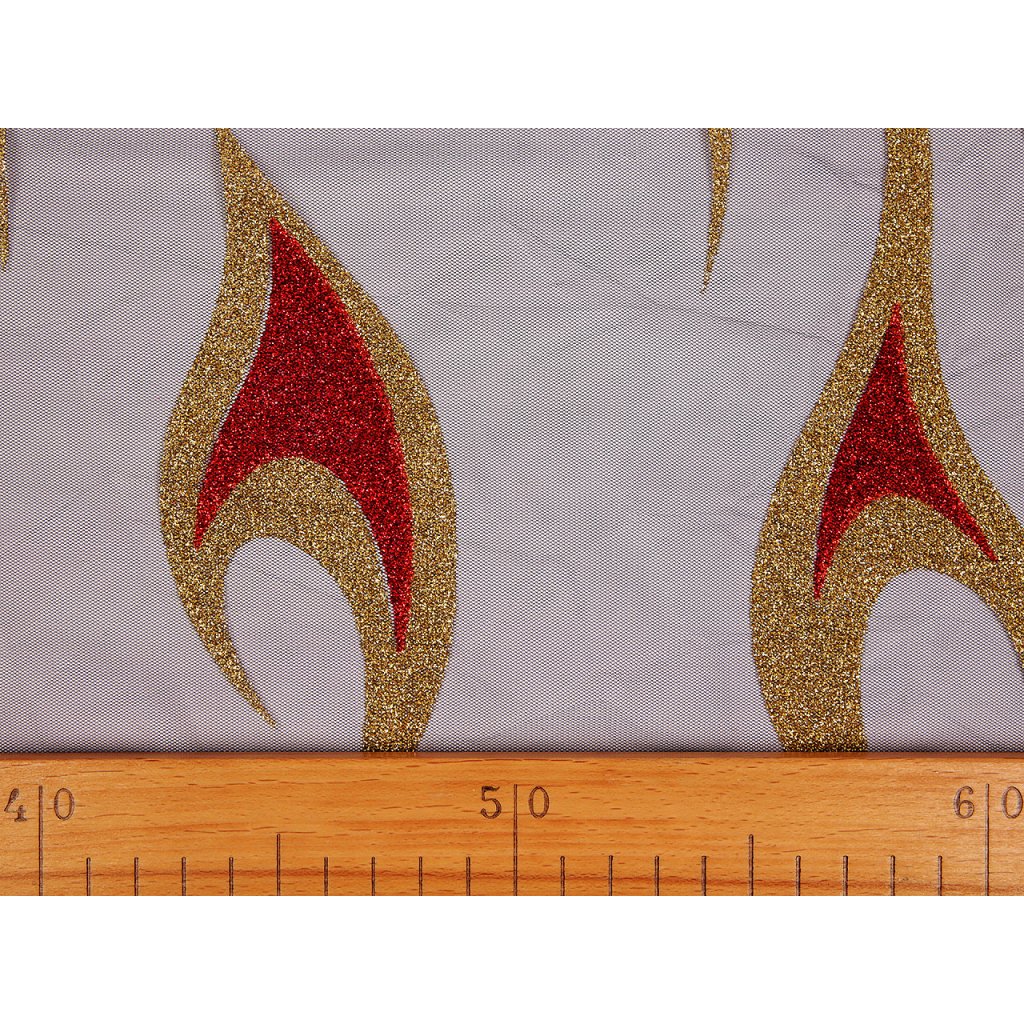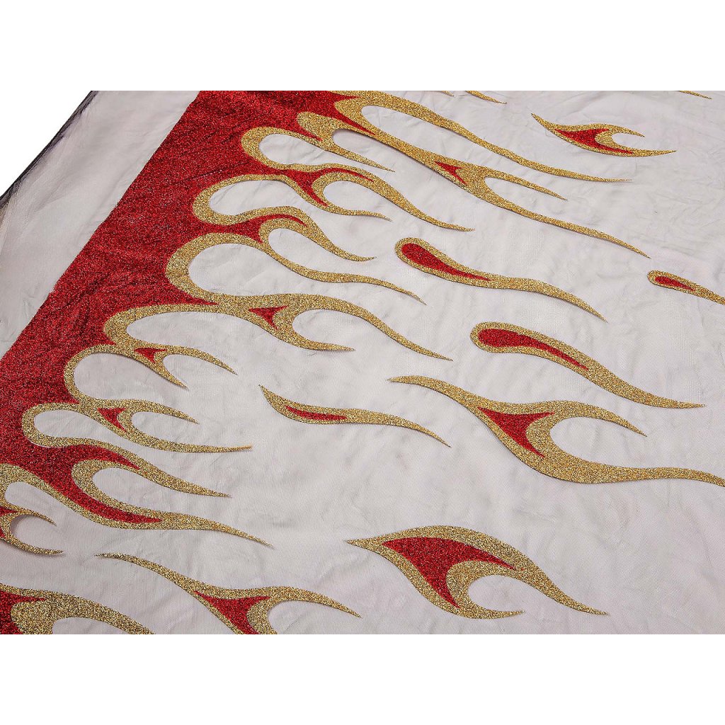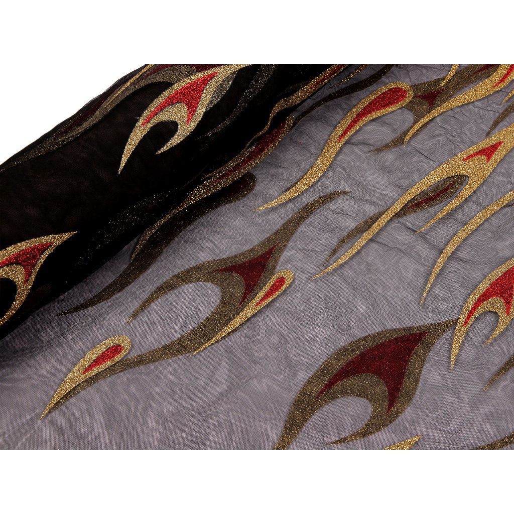Der Tüll für Bekleidung fällt durch sein Design auf – über die gesamte Breite ist auf beiden Seiten ein Print aus Glitzerflammen angebracht, die eindrucksvoll schimmern. Der Tüll ist weich, an den Printstellen jedoch steifer. Damit lassen sich Karnevalskostüme, Röcke, Teufelsumhänge und diverse Gestecke nähen. Glitzer fällt von selbst nicht so stark ab.