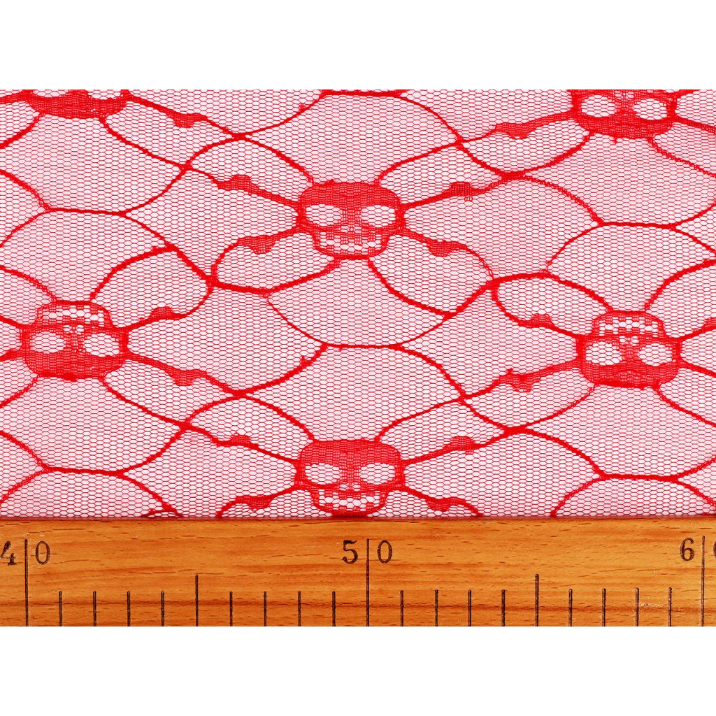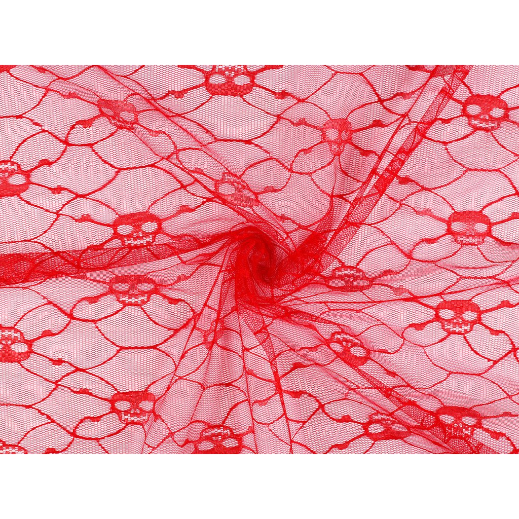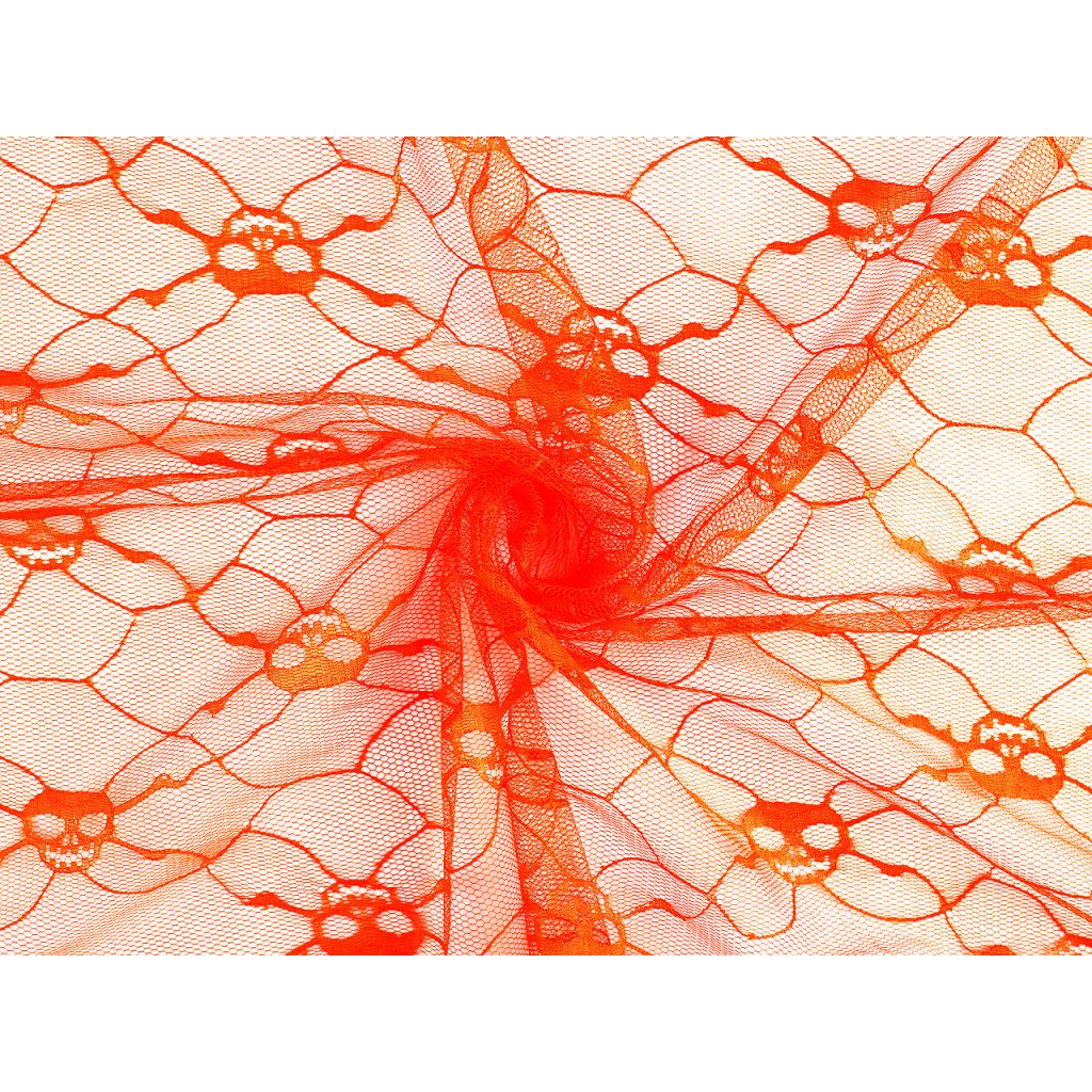 Weich fließender Tüll eignet sich mit seinem Design für Halloweenkostüme und gruselige Arrangements. Auf ihm finden sich Totenkopfmotive .