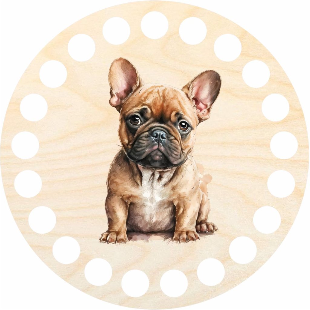 Dieser runde Holzboden aus Birken-Sperrholz mit französischem Bulldoggenmotiv mit einem Durchmesser von 10 cm ist nicht nur ein solider Holzboden für gehäkelte Untersetzer, sondern kann auch als stilvoller Boden oder Holzdeckel verwendet werden.