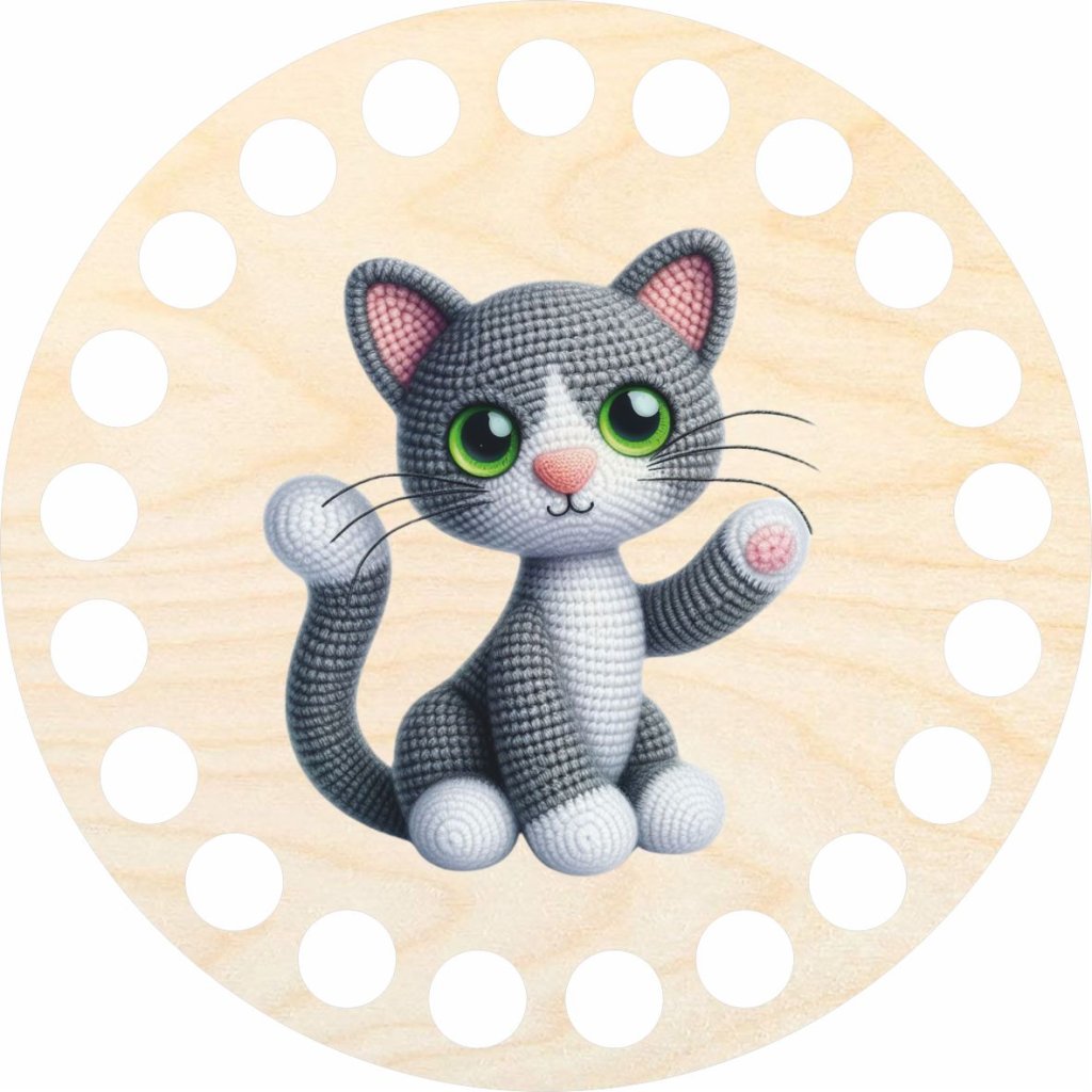 Dieser runde Boden aus Birken-Sperrholz mit einem Durchmesser von 10 cm und einem Häkeltiermotiv ist eine solide Basis für gehäkelte Untersetzer, kann aber auch als stilvoller Boden oder Holzdeckel verwendet werden.