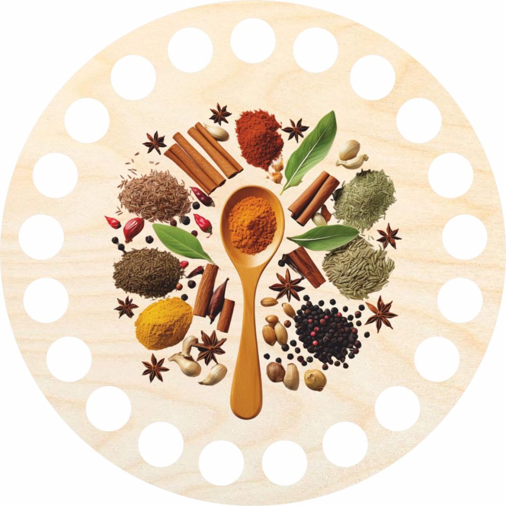 Dieser runde Ausschnitt ist die ideale Wahl für Häkelliebhaber, die Untersetzer mit einem authentischen, natürlichen Look kreieren möchten. Mit einem Durchmesser von 10 cm und einer Materialstärke von 3 mm bietet er eine solide Basis für Ihre handgefertigten Produkte. Seine Oberfläche ist mit einem schönen Gewürz- und Kräutermotiv verziert, das im UV-Druckverfahren aufgebracht wird und so für lang anhaltende Farbe und Lichtechtheit sorgt. Dieses Druckverfahren sorgt dafür, dass das Motiv auch bei häufigem Gebrauch lebendig und sauber bleibt.