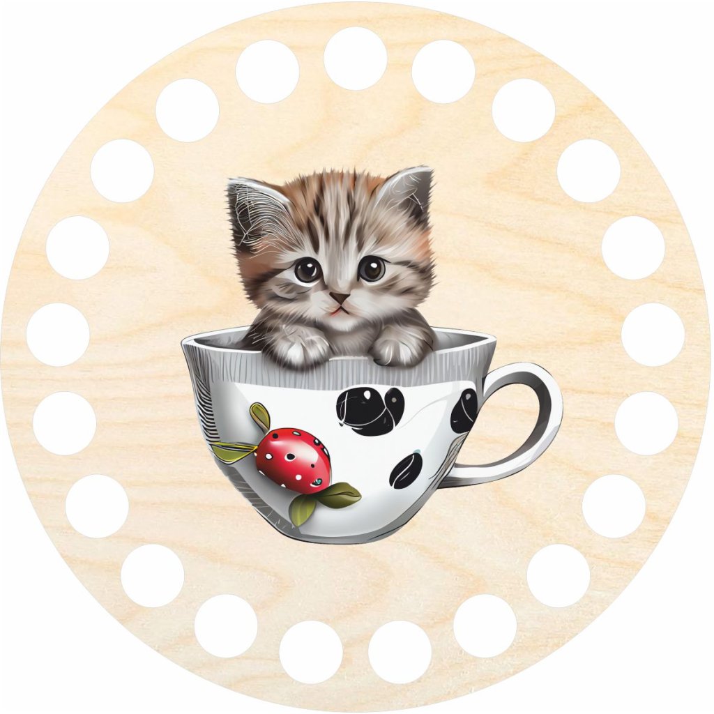 Dieser runde Holzboden aus Birken-Sperrholz mit Kätzchenmotiv in einem Becher mit 10 cm Durchmesser ist nicht nur eine solide Basis für gehäkelte Untersetzer, sondern kann auch als stilvoller Boden oder Holzdeckel verwendet werden.