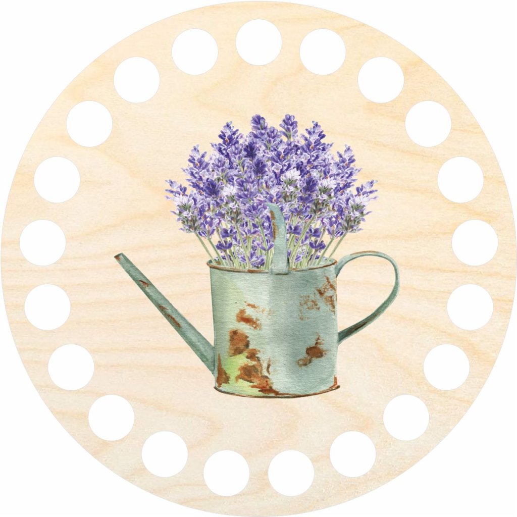 Untersetzer oder Holzdeckel für Häkelkörbe aus Spaghetti-Garn mit aufgedrucktem Motiv einer Teekanne mit Lavendel. Erstellen Sie eine Reihe einzigartiger Untersetzer. Sie finden auch andere Untersetzer in unserer Lavendelserie, einen 15 cm großen Holzboden in ähnlichem Stil für die Herstellung eines Häkelkorbes oder einen 40 x 20 cm großen ovalen Boden für ein Tablett.