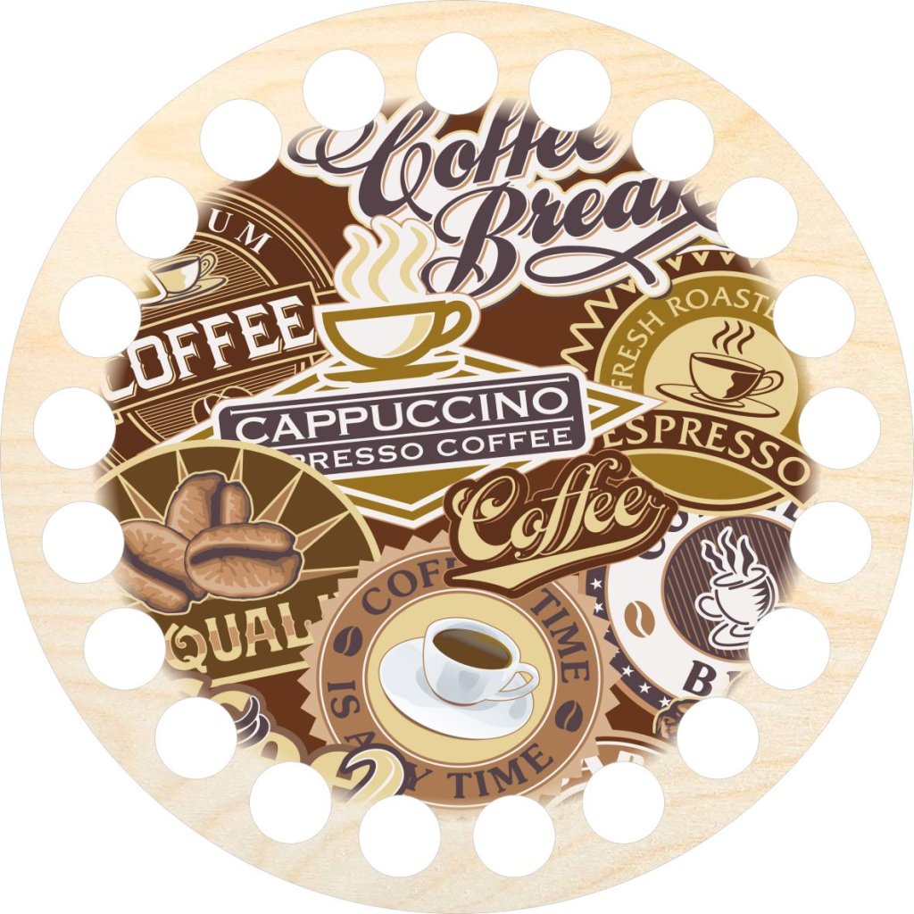 Holzdeckel für Häkelkörbe aus Spaghetti-Garn. Kann auch für die Herstellung von Untersetzern verwendet werden. Das Motiv wird mit einem UV-Drucker auf einen Deckel aus Birken-Sperrholz gedruckt.