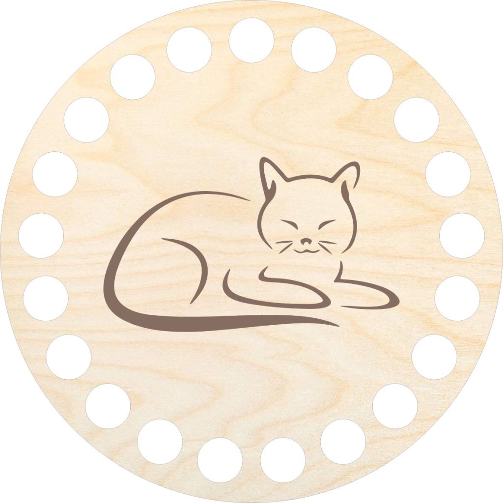 Holzdeckel mit Katzenmotiv für Häkelkörbe aus Spaghetti-Garn. Kann auch zur Herstellung von geflochtenen Untersetzern verwendet werden. Das Motiv ist mit dem Laser in den Deckel aus Birken-Sperrholz geschnitten.