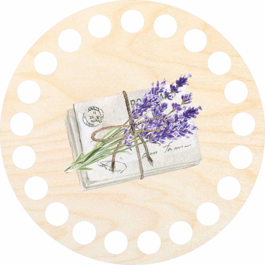 Ein Untersetzer oder Holzdeckel für Häkelkörbe aus Spaghetti-Garn mit einem aufgedruckten Motiv von Briefumschlägen mit Lavendel. Kreieren Sie eine Serie von einzigartigen Untersetzern. Sie finden auch andere Untersetzer in unserer Serie mit Lavendelmotiven.