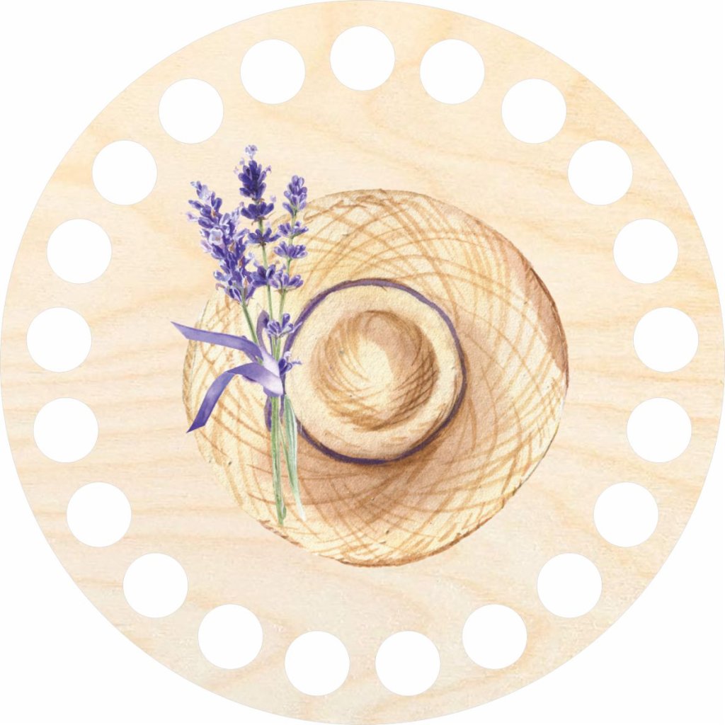 Untersetzer oder Holzdeckel zur Herstellung von Häkelkörben aus Spaghetti-Garn mit aufgedrucktem Strohhutmotiv mit Lavendel. Kreieren Sie eine Serie von einzigartigen Untersetzern. In unserem Angebot finden Sie auch andere Untersetzer für die Lavendelserie, einen 15 cm großen Holzboden in ähnlichem Stil für die Herstellung eines Häkelkorbes oder einen ovalen Boden 40 x 20 cm für die Herstellung eines Tabletts.