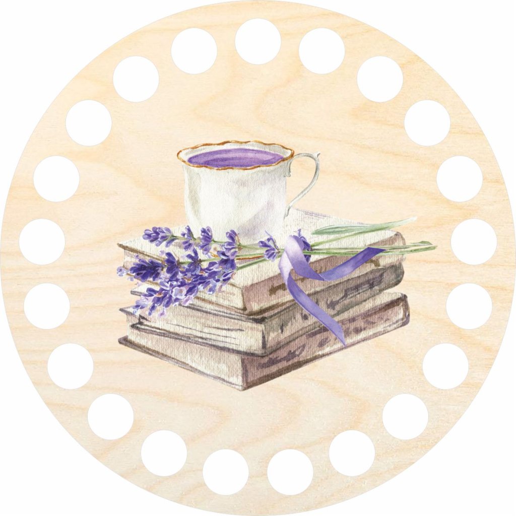 Untersetzer oder Holzdeckel zur Herstellung von Häkelkörben aus Spaghetti-Garn mit aufgedrucktem Tassen- und Buchmotiv. Kreieren Sie eine Serie von einzigartigen Untersetzern. Sie können auch andere Untersetzer aus unserer Lavendel-Serie finden.