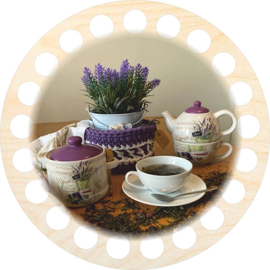 Untersetzer oder Holzdeckel zur Herstellung von Häkelkörben aus Spaghetti-Garn mit aufgedrucktem Lavendelmotiv. Kreieren Sie eine Reihe von einzigartigen Untersetzern.