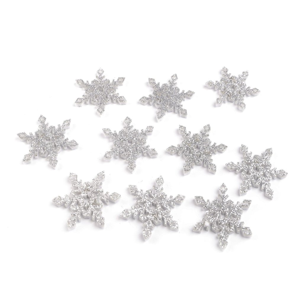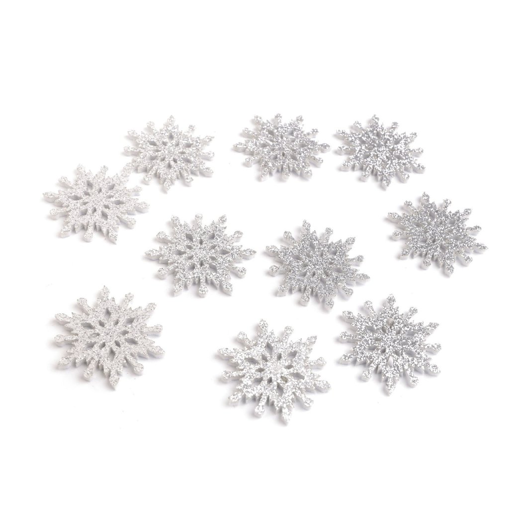 Die Schneeflocken aus Filz sind einseitig mit glitzerndem Glitter verziert. Sie können damit Adventskränze, Schachteln, Namensschilder auf der festlichen Tafel, Geschenke und diverse Weihnachtsdekorationen bekleben. Glitzer fällt nicht ab.