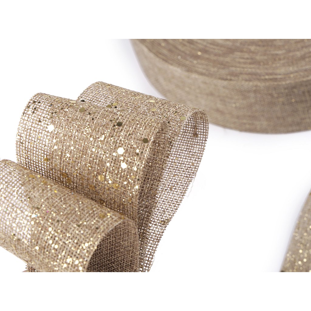 Das Band, das Jute imitiert , ist manchmal mit funkelndem Glitzer verziert. Es fühlt sich fester an, die Kanten fransen nicht aus. Sie können das Band zu dekorativen Zwecken verwenden, zum Beispiel zum Arrangieren von gebundenen und getrockneten Blumen oder als Schmuck für Kränze, Schachteln und andere Dekorationen. Dank des Glitzers eignet es sich besonders gut für Weihnachtsgestecke.